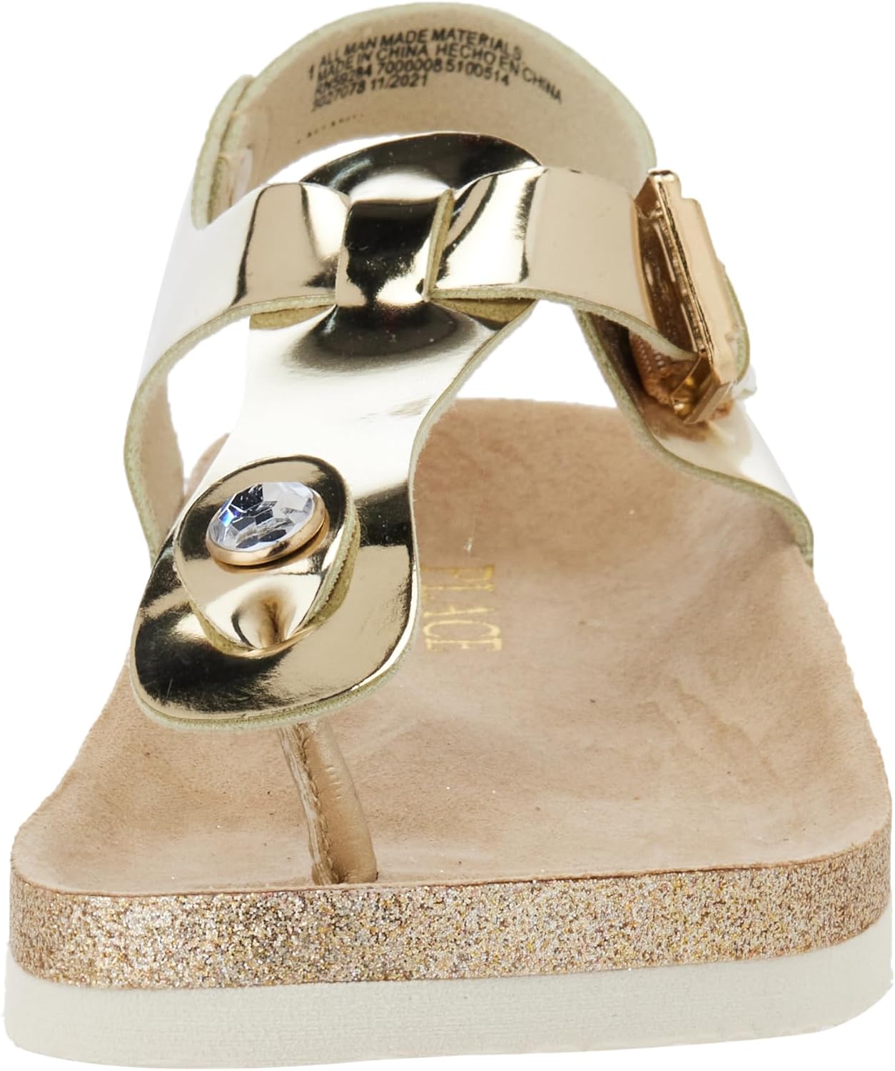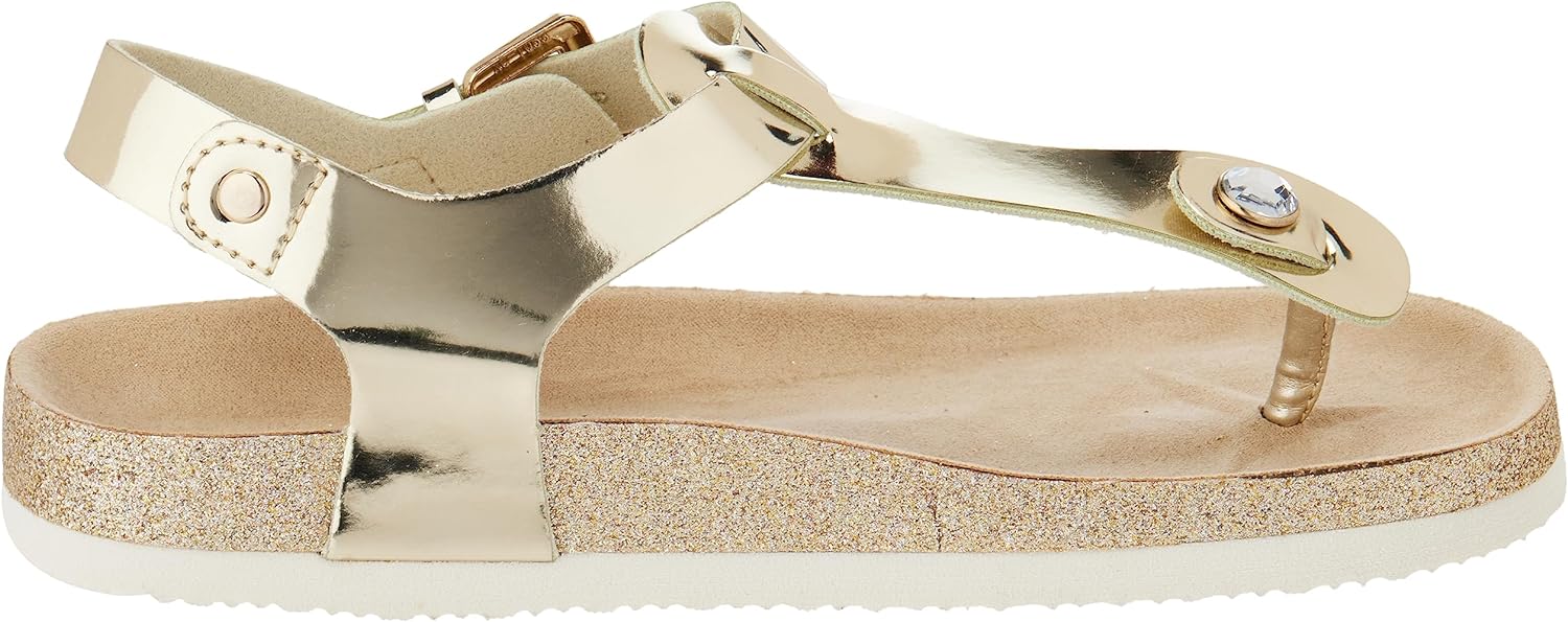 The Children's Place Luna Braid Thong Sandals is made of 100 percent metallic polyurethane. Slip-on style and man made outsole. Metallic T-strap. Jewel at front T-strap. Glitter detail along outsole. It is durable, soft and comfortable. Comes in 2 size and gold color.
