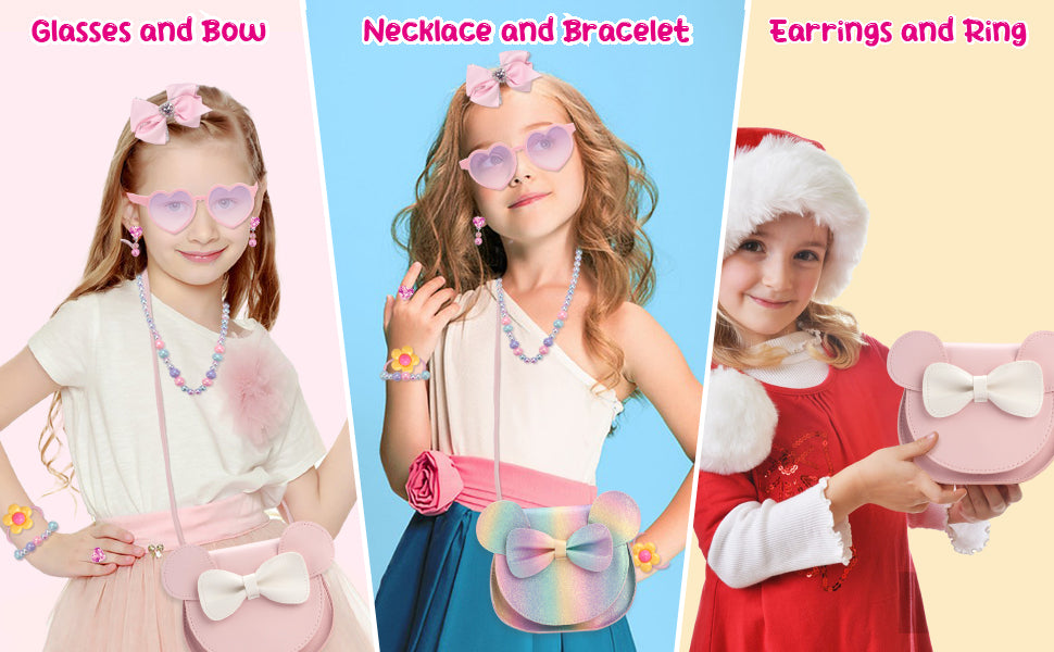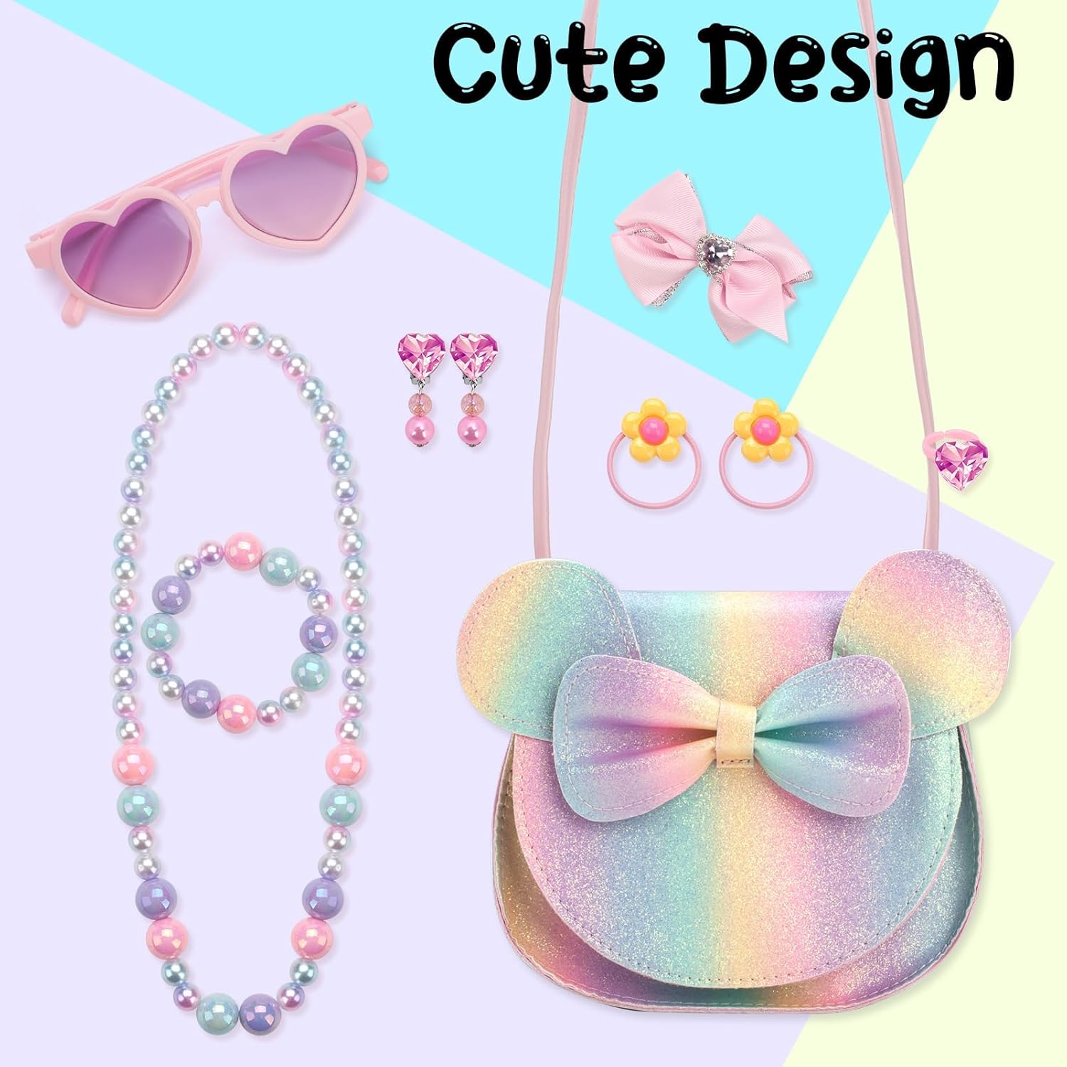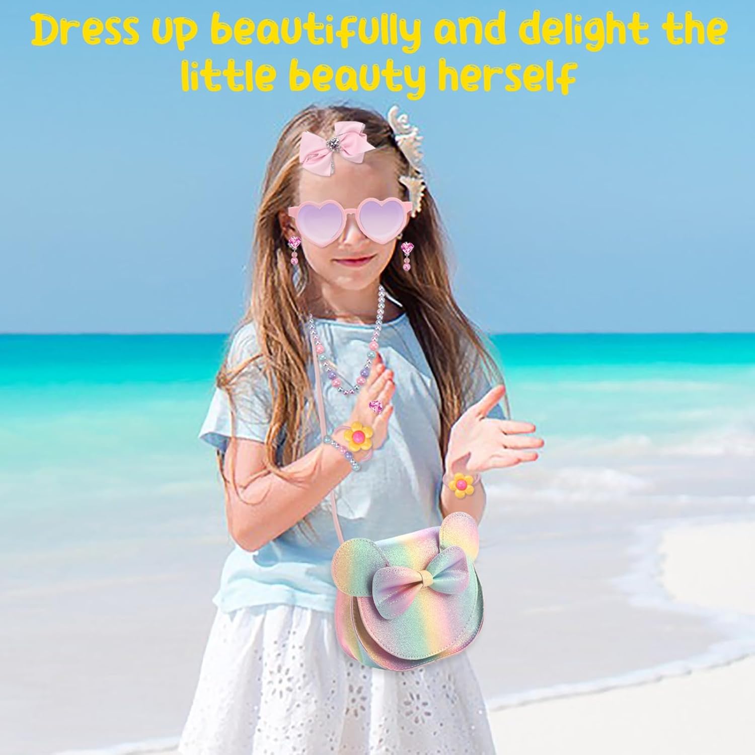 Girls Shoulder Bags Set, Cute Kids Purse Crossbody Bags, Purse for Little Girls, with Kids Dress Up Jewelry Set Pretend Play Accessories, Birthday Presents for 3 4 5 6 Years Old Girls