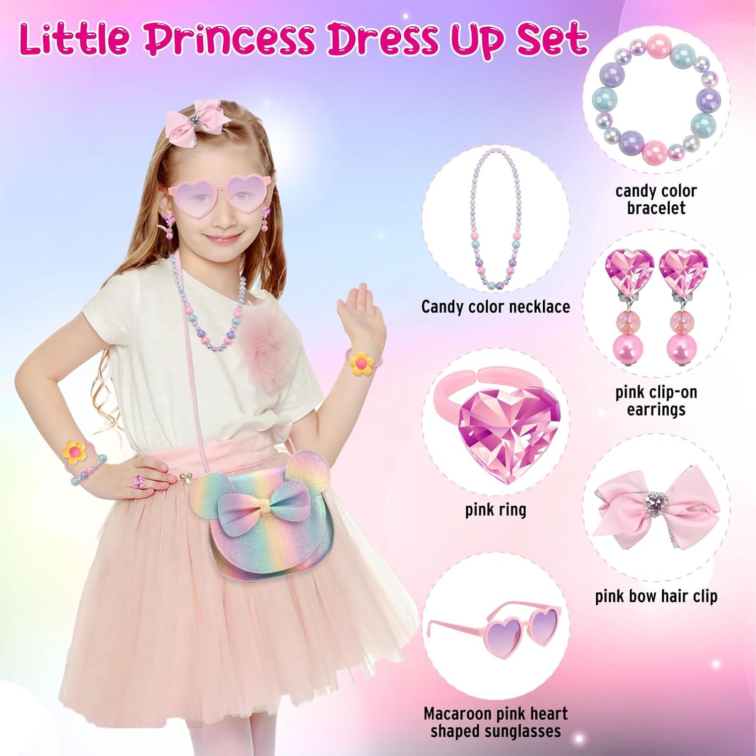 • 👑💖 Ultimate Princess Accessory Kit: Dive into the world of fashion with this complete princess accessory set. Your little one will receive a crossbody bag, clip-on earrings, a heart-shaped ring, stylish sunglasses, a bowknot hair clip, a colorful necklace, a bracelet, and a pair of flower bracelets. It's everything a budding fashionista needs to stand out.