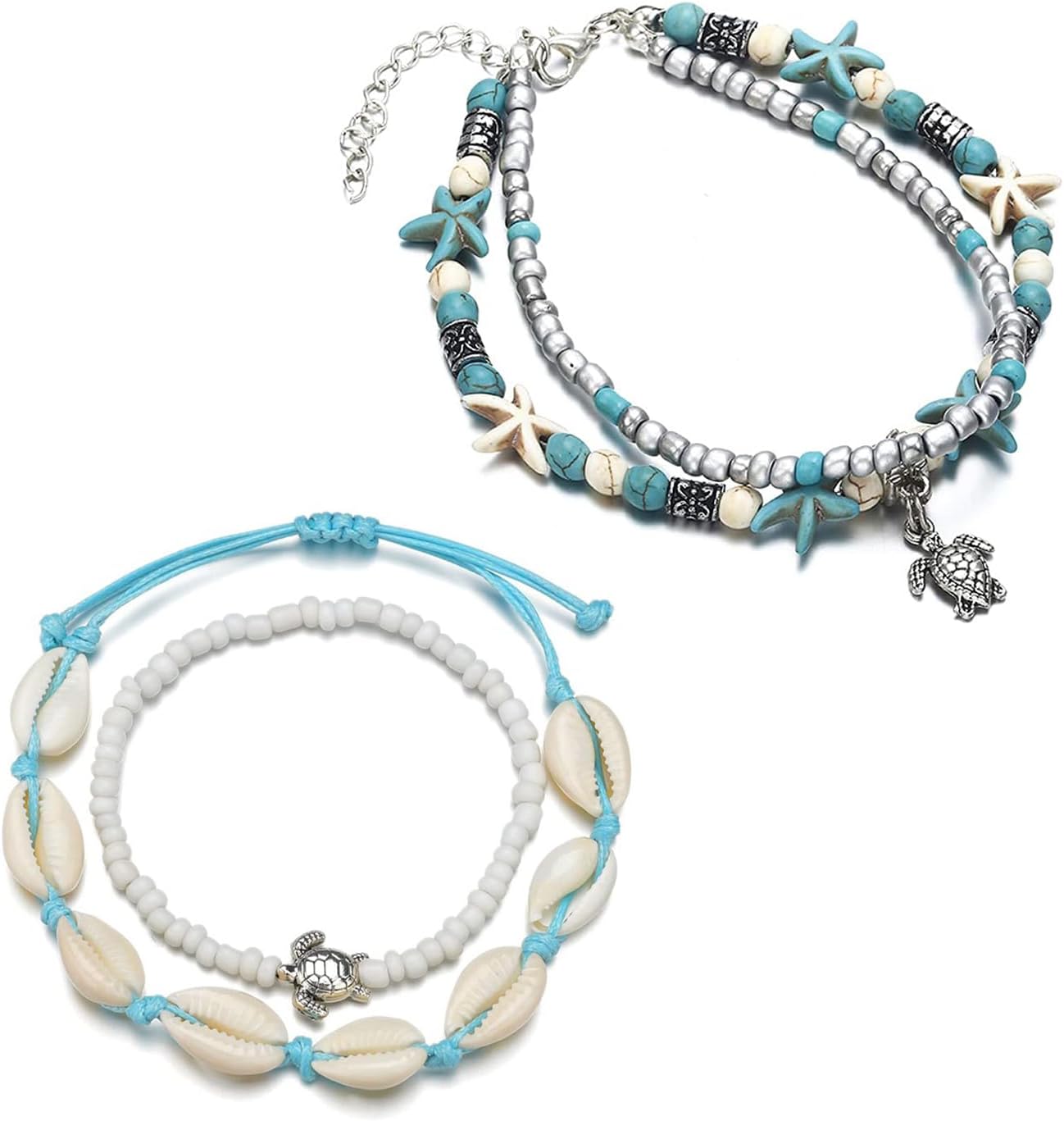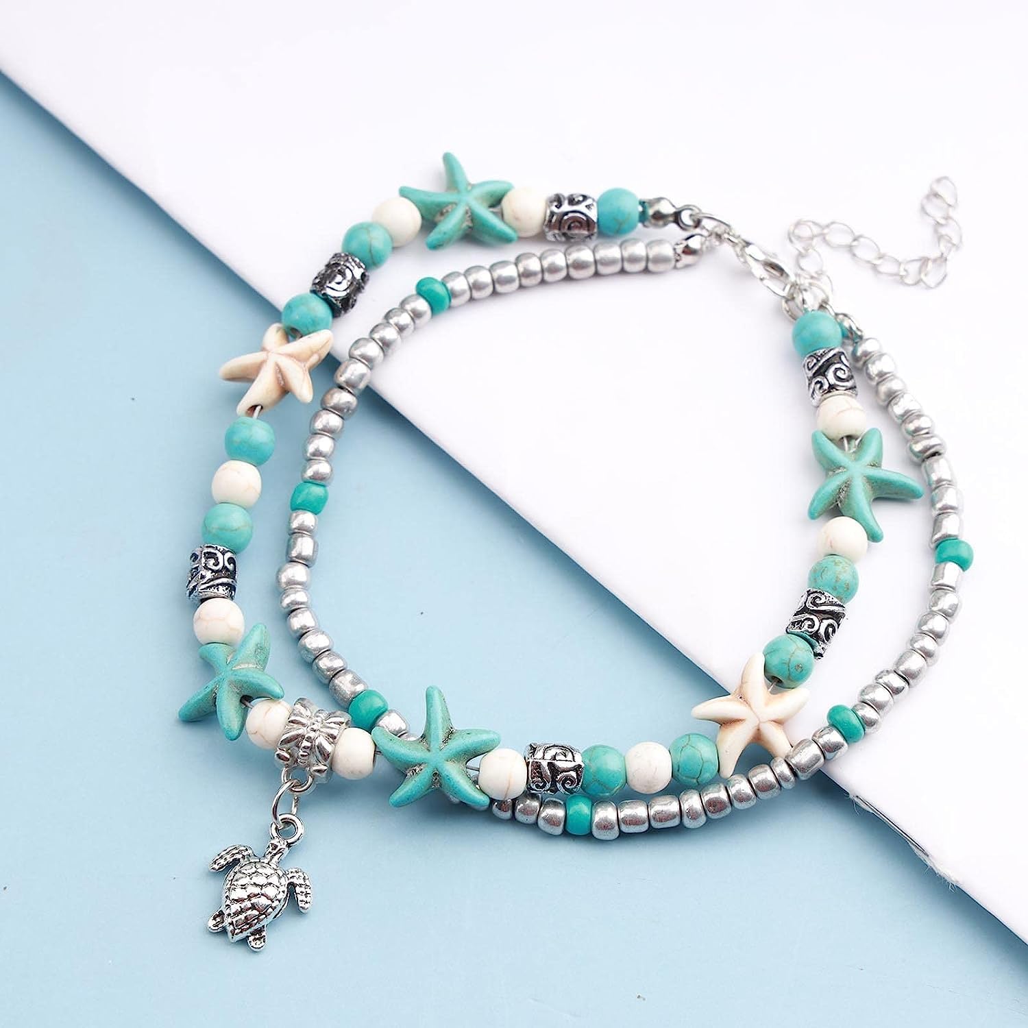 Jewelry Type: Beach Anklets for Women and Teen GirlsStyle: Boho Ankle Bracelets, Cute and TrendySize: The length shows in our pictures, Adjust slip-on woven rope allows wearers to create the perfect fit, no worry about size problem.Quality: Light, Durable, and ComfortableSummer beach anklets, step into the world of boho-chic with these beautiful anklet!!Package Include:-1 X summer anklet-1 X sea turtle ankletStyle: Cute Sea Animal Anklet and Stylish Beach JewerlyColor: BlueMaterial: Turquoise Bead and Alloy ChainSize: Turtle Pendant 1.5cm*1.6cm; Turquoise Bead Length: 7.5 inch + 1.5 inch extend chainProduct: Beach Turle Anklet, Blue Dolphin Anklet, Hippocampus Anklets, Wave Anklet, Whale Tail AnkletOccasion: Suitable for Beach Vocation or Lakeside WearWOMEN FASHION ANKLET BRACELETThis Is a Jewelry Piece That Complements Your Personal Style And Design. It Is Fashionable And Comfortable To Wear.This Jewelry Piece Makes a Cherished Gift For Family And Friends. Each Product Is Nicely Packaged.This Jewelry Piece Is Eye-Catching And Attention-Grabbing. Wear a Winner, Feel The Glamour!Blue Anklet Multilayer Charm Beads Foot JewelryStarfish Turtle AnkletStarfish are well known for their amazing ability to regenerate limbs. The starfish enhances periods of healing and renewal. It also represents your intuition, and how your first instincts are usually right. Symbolic Starfish Meaning - The Quick List: Strong, Patient, Ancient, Magical, Healing, Sensitive, Longevity, Renewing, Perceptive, Mysterious, Resourceful.
