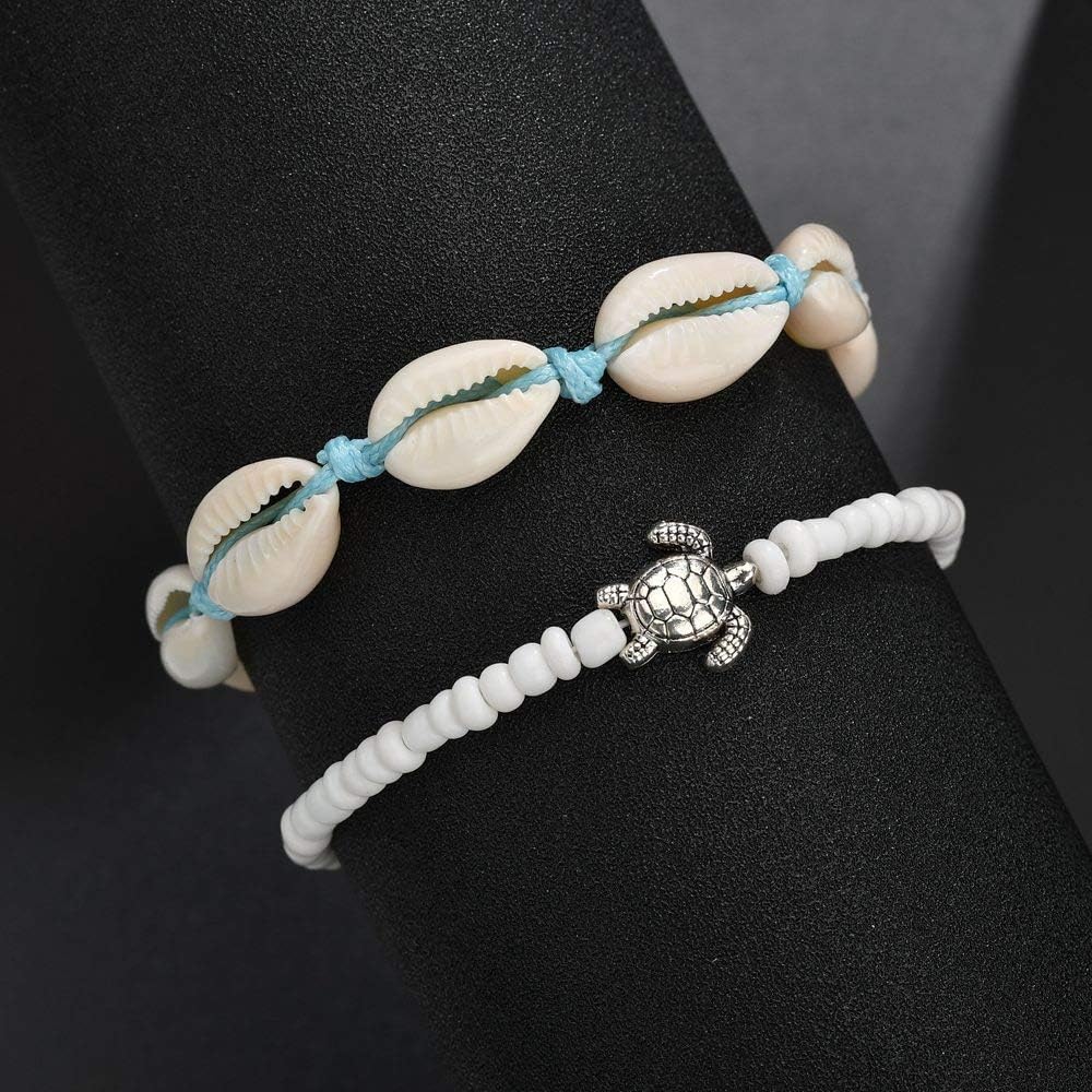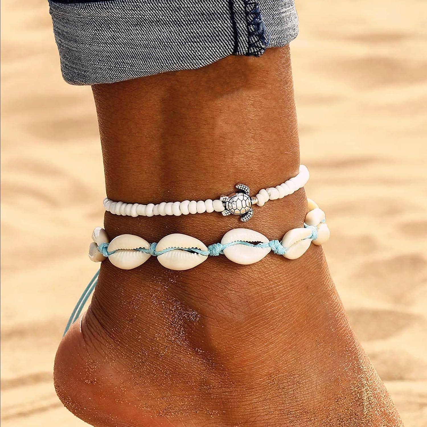 Amzuia 2 Pcs Turtle Anklets, Boho Turtle Layered Shell Anklet Set Silver Ankle Bracelets Beaded Foot Chain Beach Foot Jewelry Accessories for Women and Teen Girls