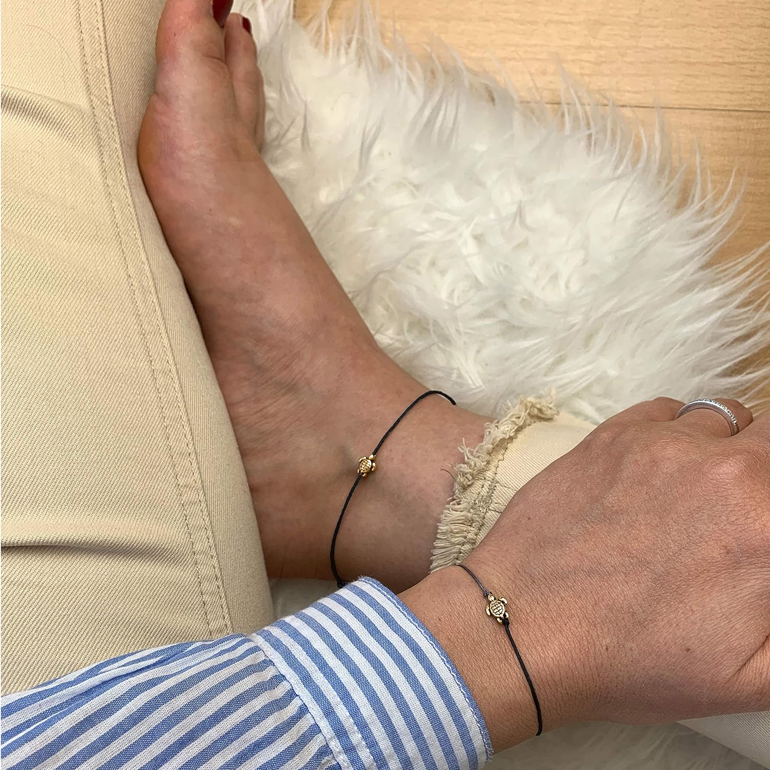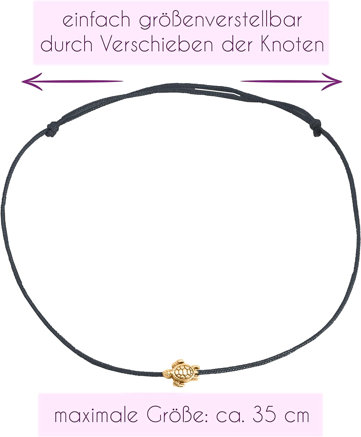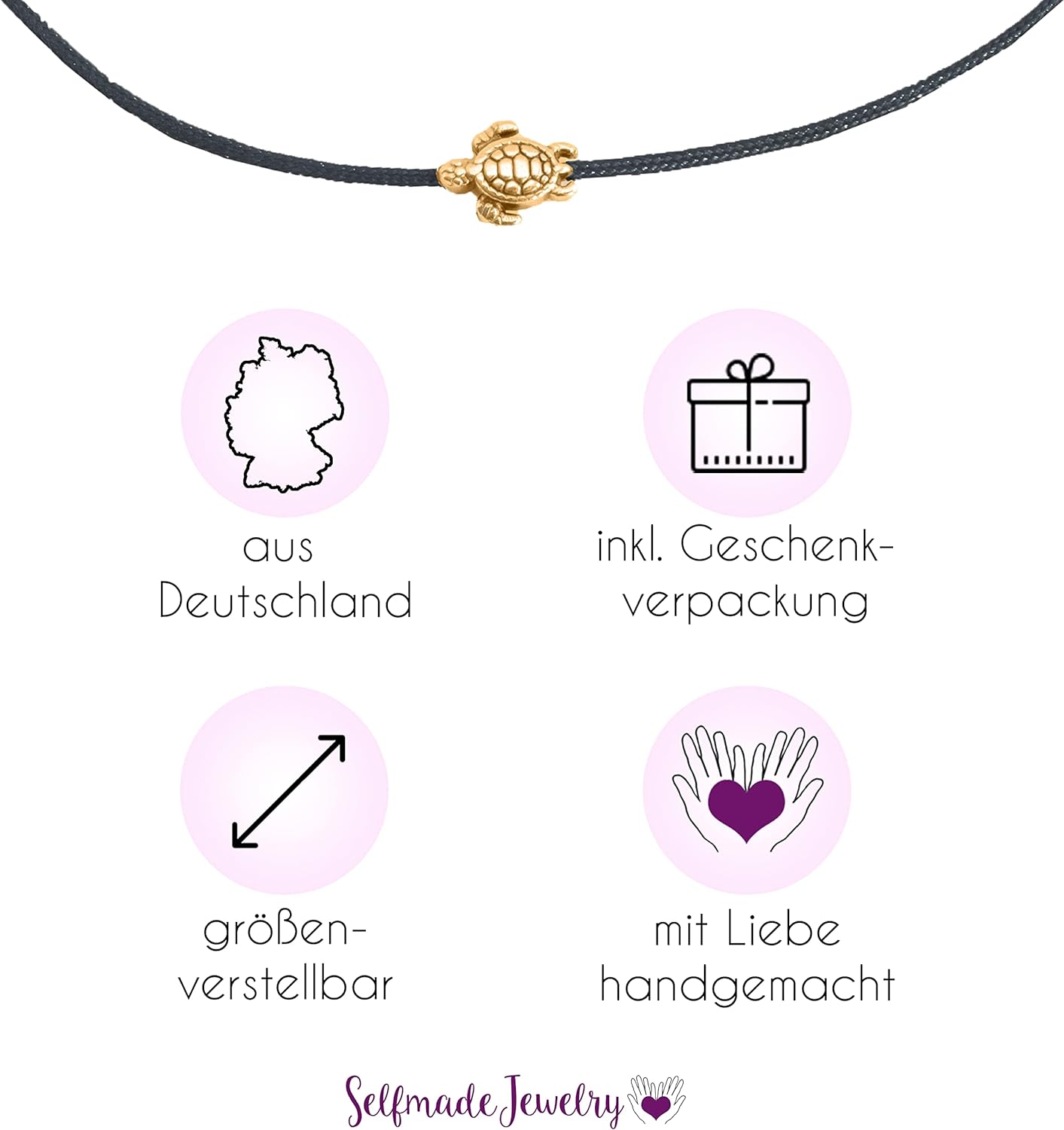 This lovely turtle anklet is handmade with love. We really love what we do and set our focus on high quality and a lovely presentation for our beautiful Ankle Bracelets. The stylish foot bracelet with the little turtle shaped pendant looks just beautiful on your ankle. The little turtle is threaded on a grey or black string and closed with a sliding knot. Due to the practical knot closure, the Selfmade Jewelry foot chain is adjustable in size and also fits very delicate ankles.Since nothing hangs down or dangles from the ankle, this handmade Anklet is super comfortable to wear and does not bother you even when you are wearing sneakers. Foot Anklets are perfect for the warm month or for your next vacation. It is the ideal beach jewelry for women and girls.A handmade jewelry piece is a wonderful gift for a dear friend or just for yourself. The anklet comes already packaged in a purple jewelry bag. The foot chain itself is on a card with the words "Good luck Anklet for you" and a "handmade with love" stamp. So the jewelry for women and girls is already perfectly packed as a gift.Turtle Anklet Product Details:Color: silver and rosegold availableMaterial: metal alloy and makramee band Size: adjustable up to shoe size 10handmade with love ❤Satisfaction GuaranteeIf you are not satisfied with our Selfmade Jewelry anklet or bracelet, you can of course return it within 30 days and get your money back!