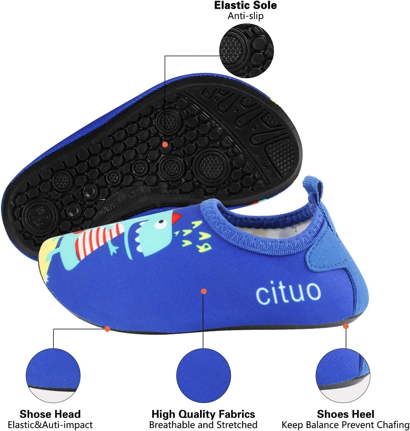 • ✅COMFORTABLE FABRIC: The upper of our water shoes for kids is smooth and stretch that made of a diving material with breathable and quick-dry ability. No Sogginess. No smell. No fadeness and Not stuffy.
