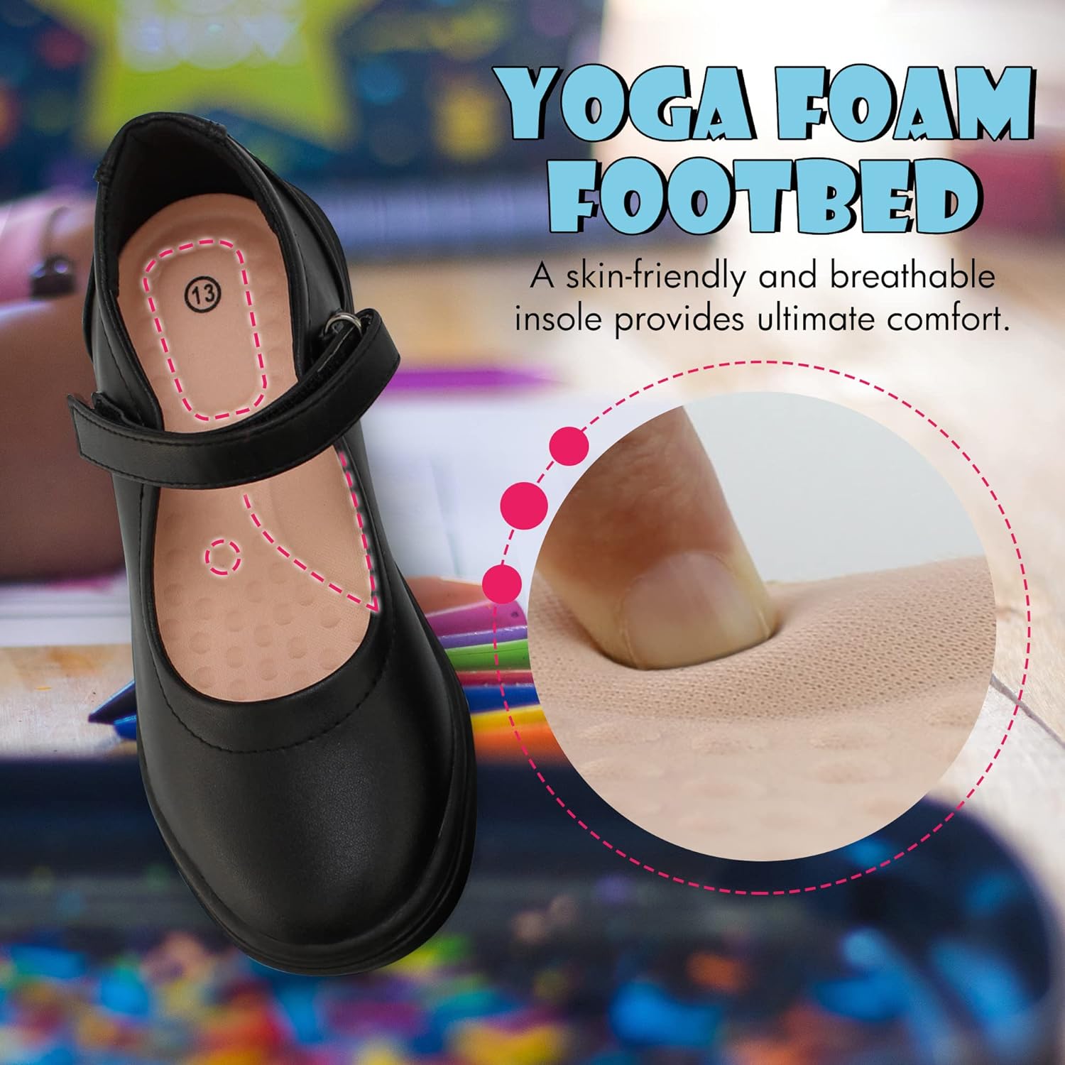 - SKIN-FRIENDLY & BREATHABLE: Cushy yoga foam footbed for all day comfort and support, keep busy feet comfy from lessons to after school clubs.