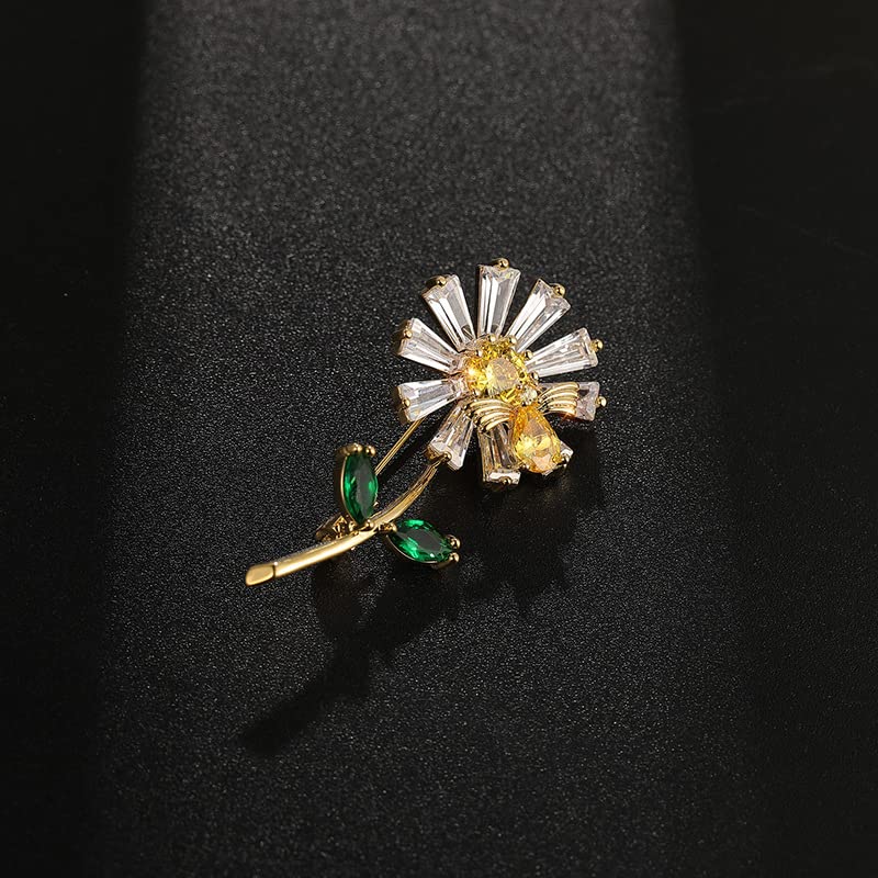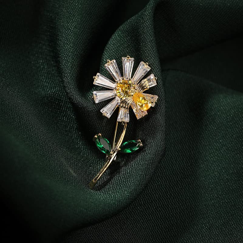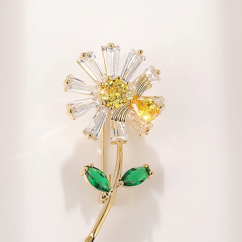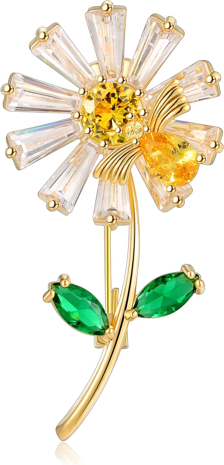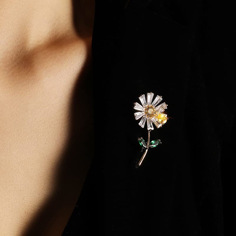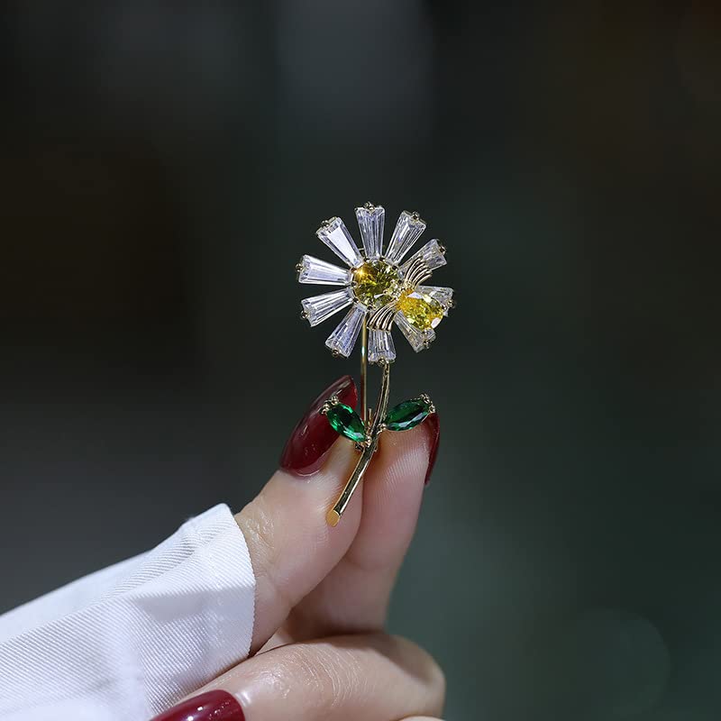 • Shiny Zircon Daisy Brooch -----Daisy Flower Brooch Pins. Easy to wear, fast and easy clip on the collar or coat jacket. Sunflower has the meaning of brave pursuit, because its flowers always face the sun, just like people have been pursuing their dreams or happiness. Giving sunflowers to friends is to wish them the courage to pursue everything they want.