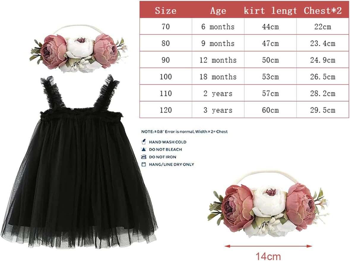 Layered Tulle Tutu Dress for Baby Girls.Package:1 x Tutu Dress1 x Flower HeadbandTag Size------Suggested Age------Length(From Shoulder)-------Chest70 --------- 6 Months --------- 17.3" --------- 8.7"*280 --------- 9 Months --------- 18.5" --------- 9.2"*290 --------- 12 Months --------- 19.7" --------- 9.8"*2100 --------- 18 Months --------- 20.8" --------- 10.4"*2110 --------- 2 Years --------- 22.4" --------- 11.1"*2120 --------- 3 Years --------- 23.6" --------- 11.6"*2Tip:1.Hand-wash,Air-dry.2.Elastic Shoulder strap can fit baby girl different ages,You can choose the closest size range based on age and height.