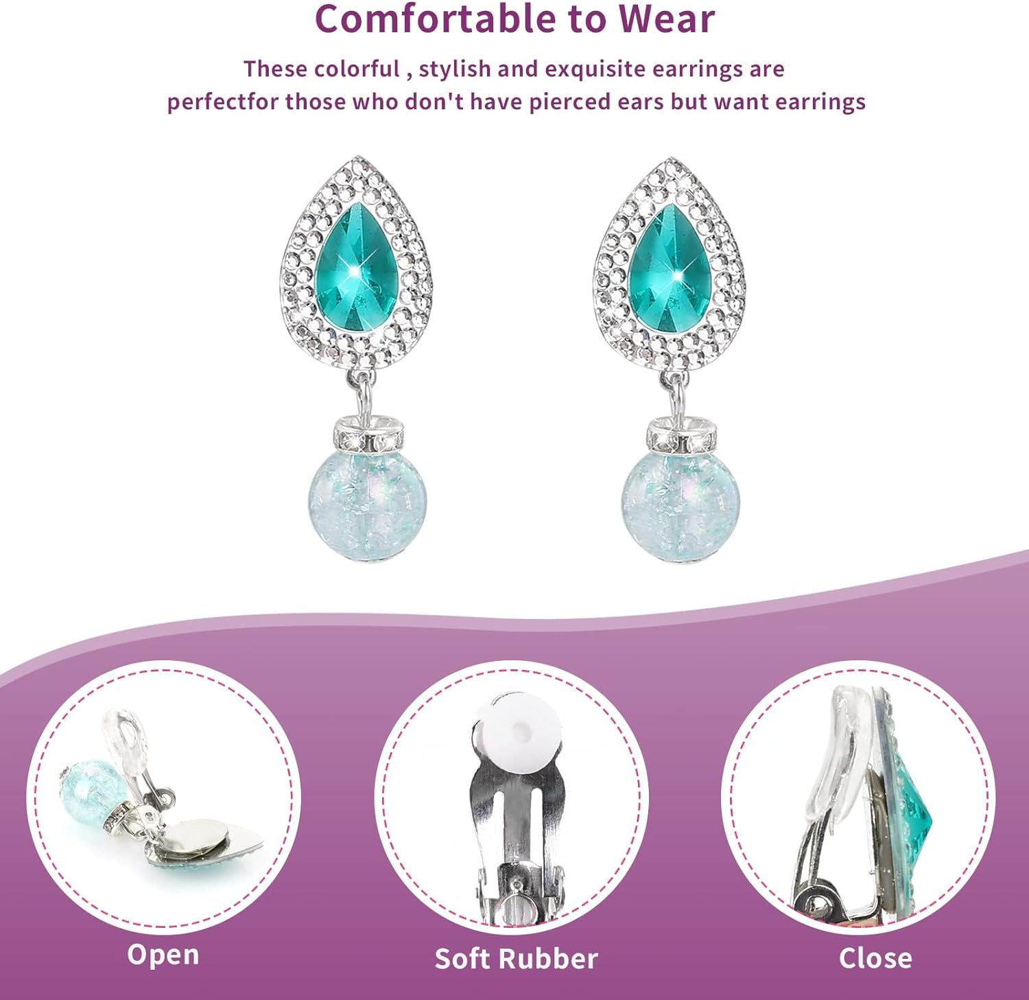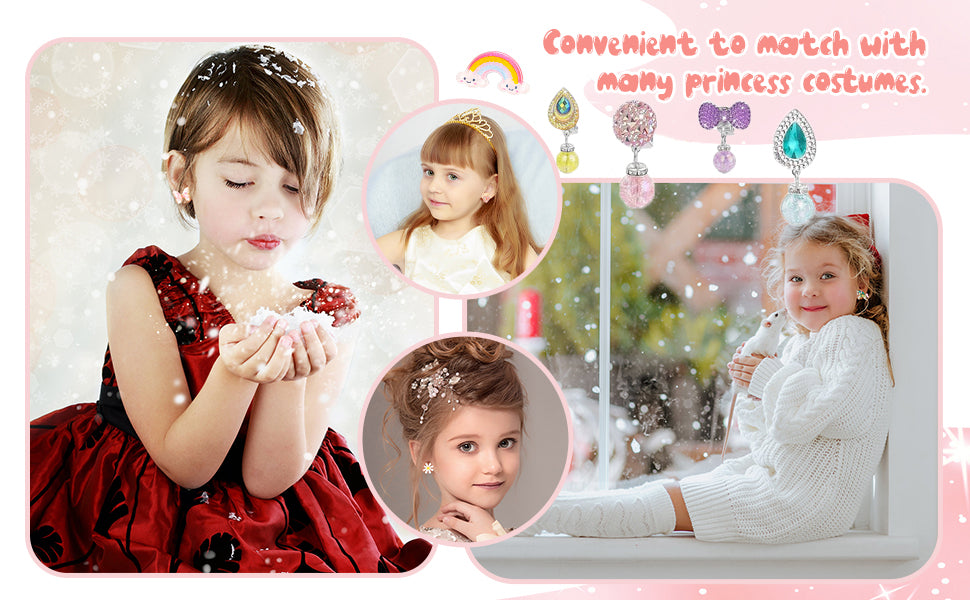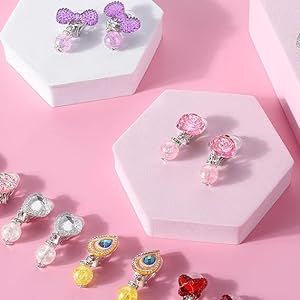 • HIGH QUALITY MATERIALS: These princess clip on earrings set are made of resin, safe and high quality, you can use it without worry. With soft silicone cushion, gentle for your girls.