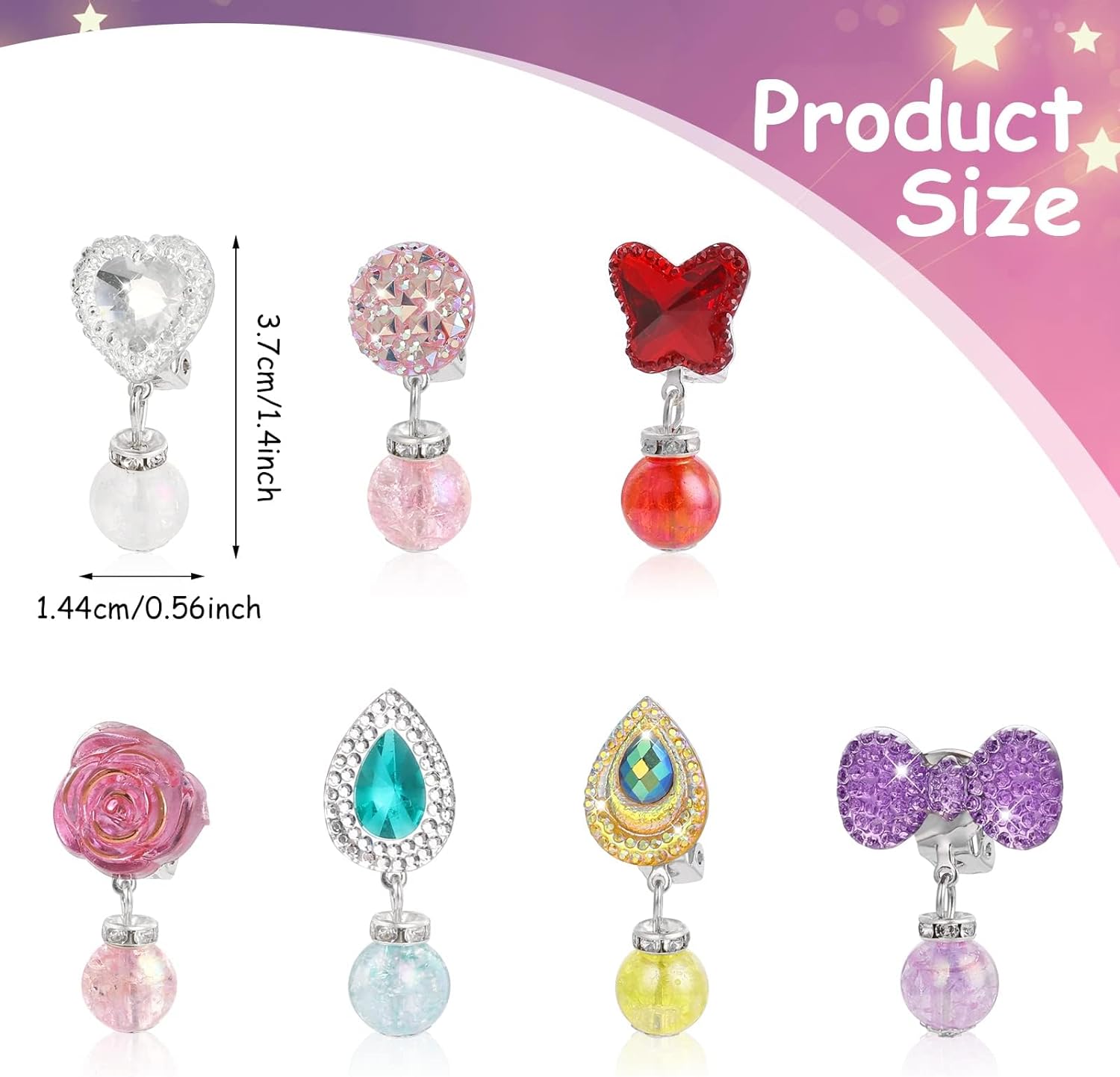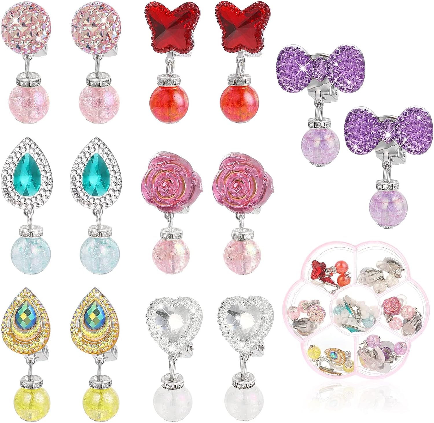• WHAT YOU WILL RECEIVE: 7 pairs different kinds of girls clip on earrings in total, shinny and pretty, tiny. Girls play earring are packed in a clear flower box. You can give them to your kid or other children. Imagine how cute they look when they wear them.