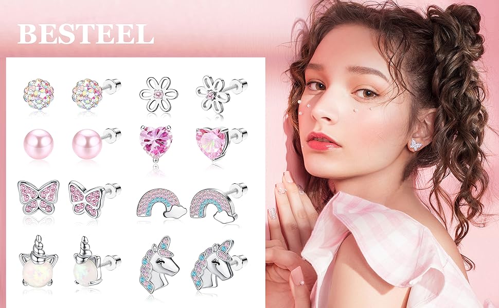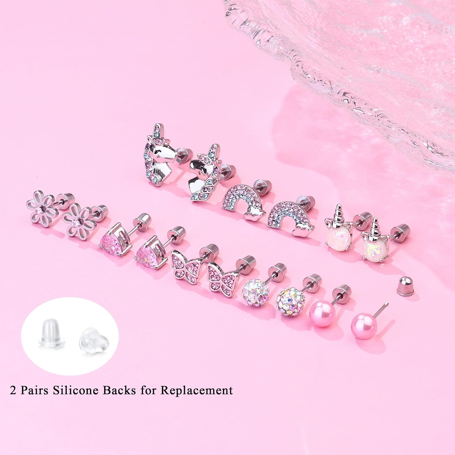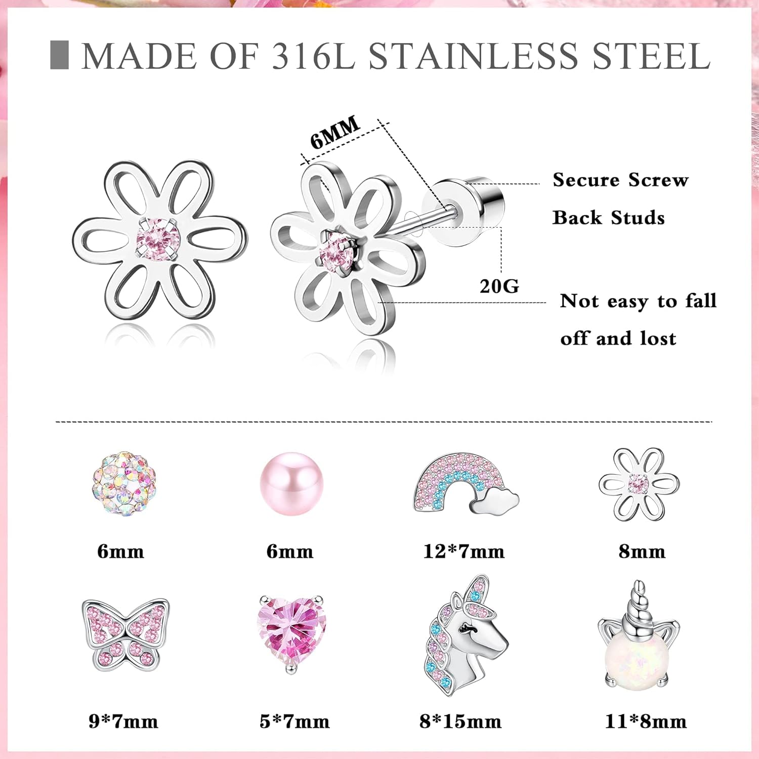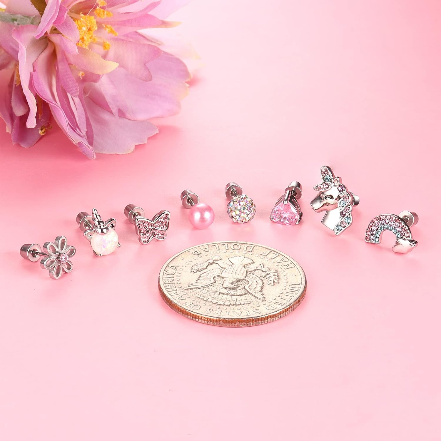 BESTEEL 8 Pairs Cute Screw Back Earrings for Women Pink CZ Heart Unicorn Stud Earrings Stainless Steel Flower Butterfly Screwback Earrings Set