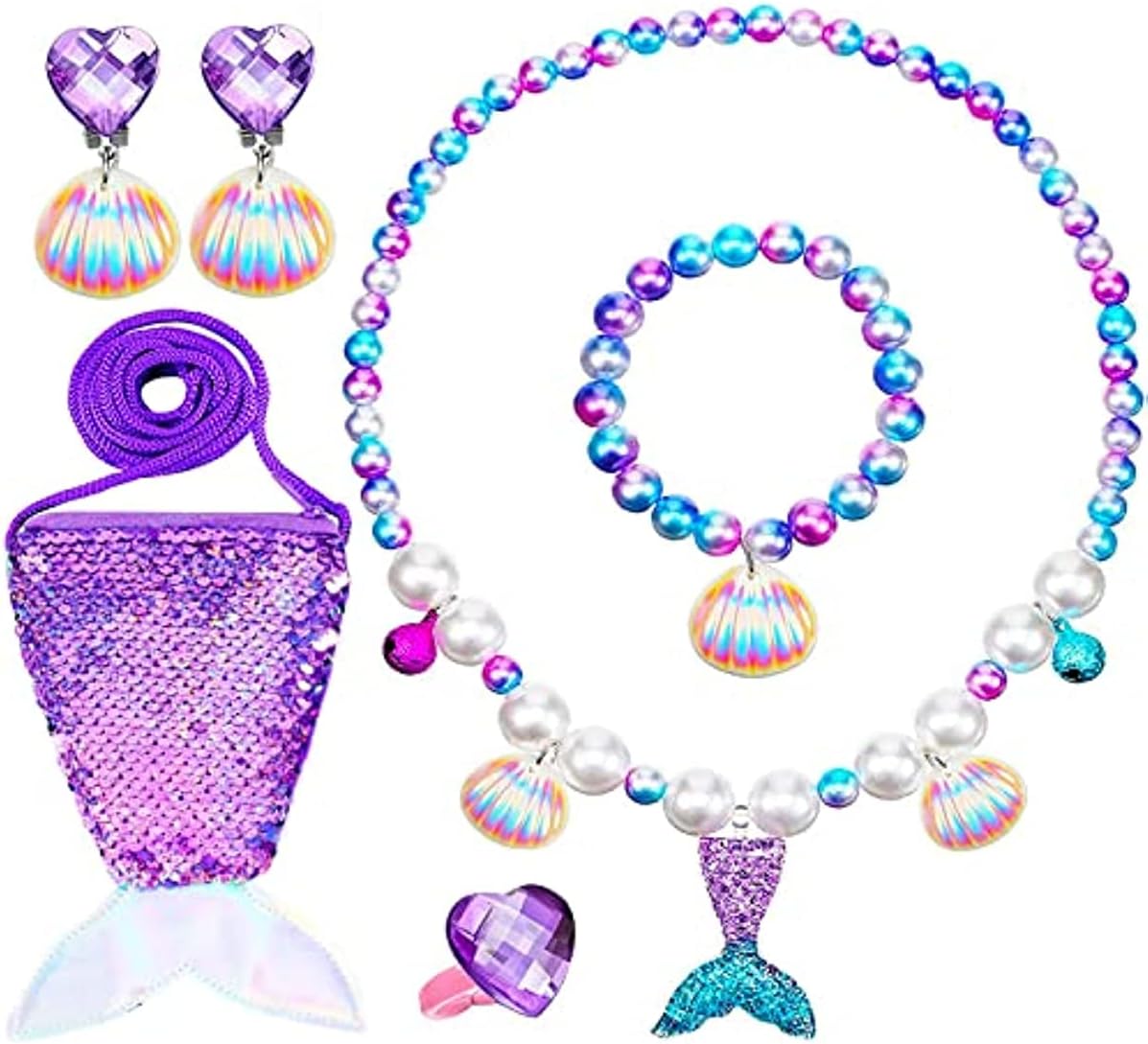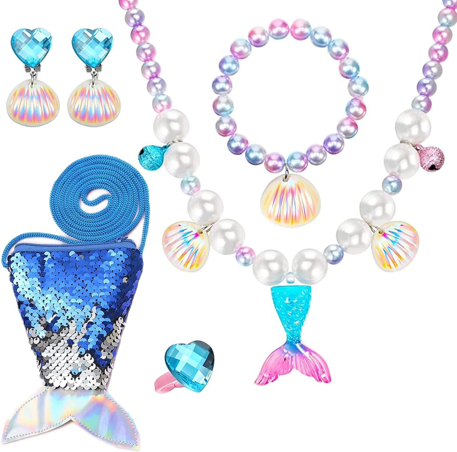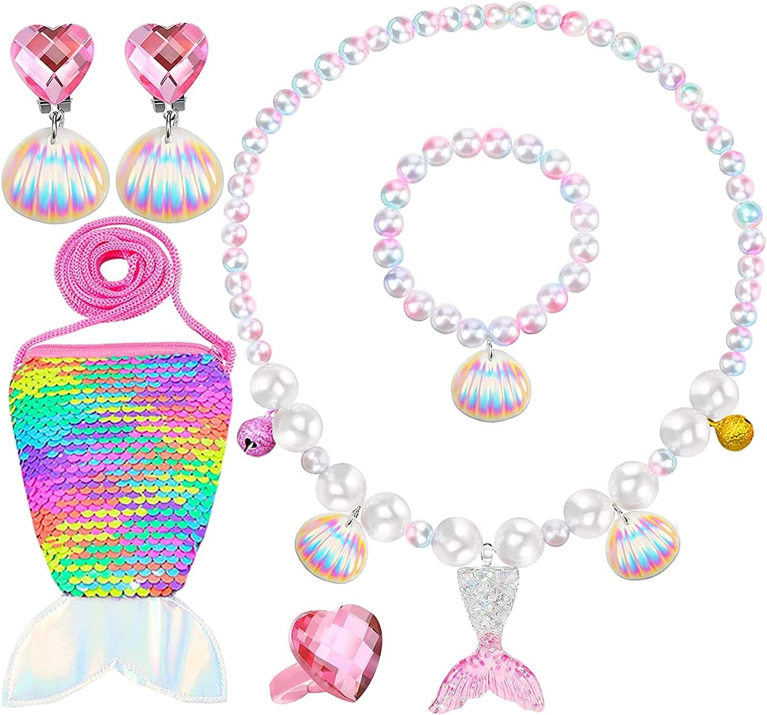- Perfect Size for All Kids: Our kids jewelry for girls come with bling mermaid purse for girls, sparkle and cute. Mermaid bracelet and necklace has elastic, girls shell ring are open design, can wear and take off easily, really a charm play jewelry for little girls.