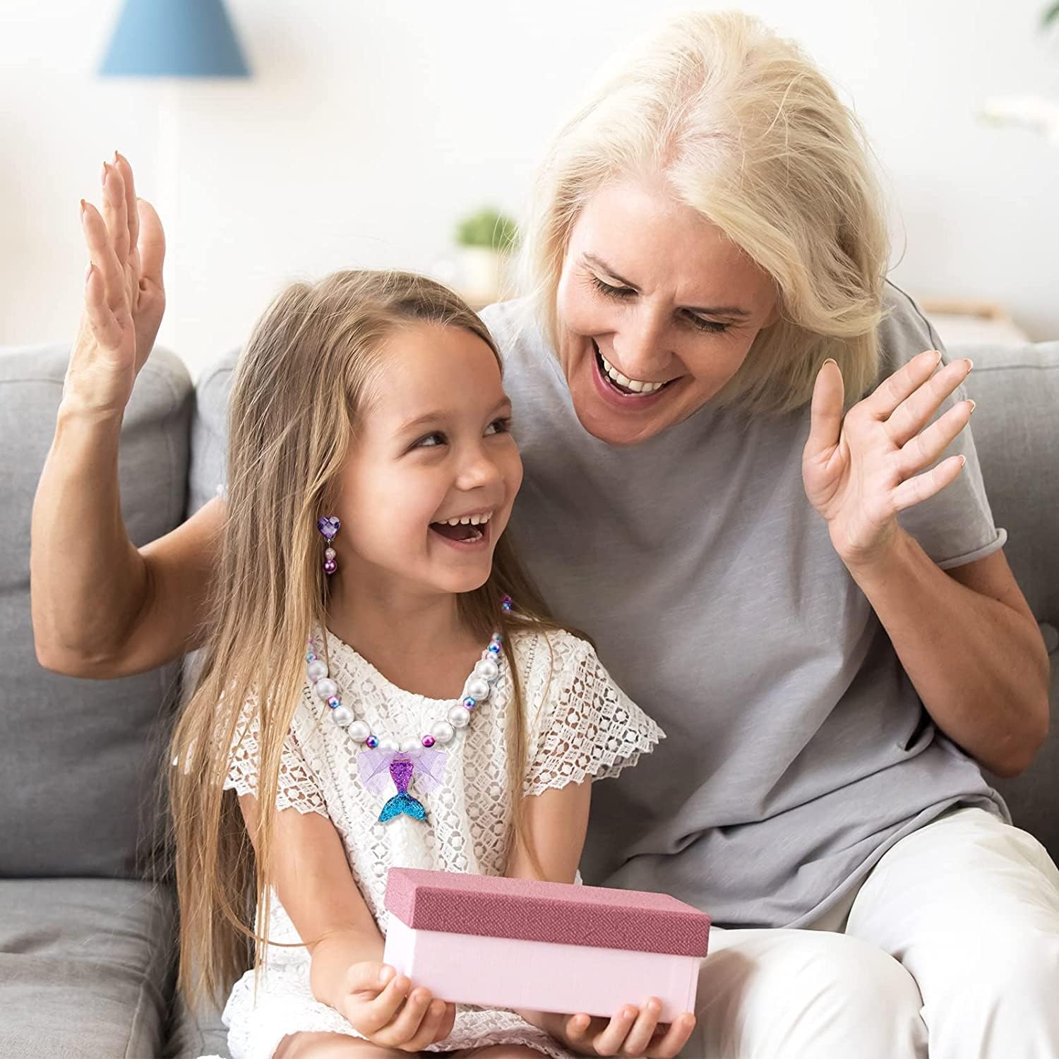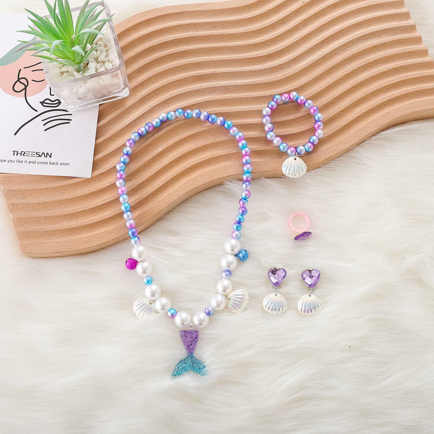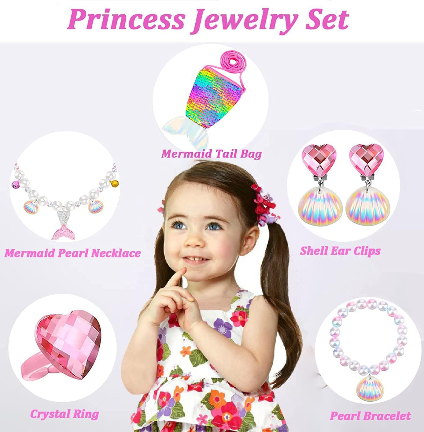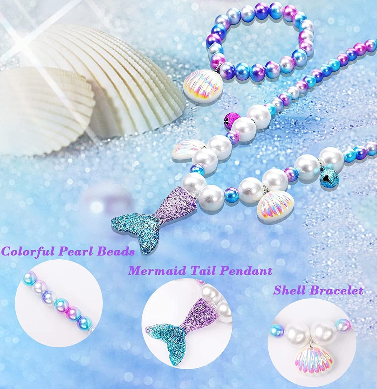 - Perfect Size for All Kids: Our kids jewelry for girls come with bling mermaid purse for girls, sparkle and cute. Mermaid bracelet and necklace has elastic, girls shell ring are open design, can wear and take off easily, really a charm play jewelry for little girls.