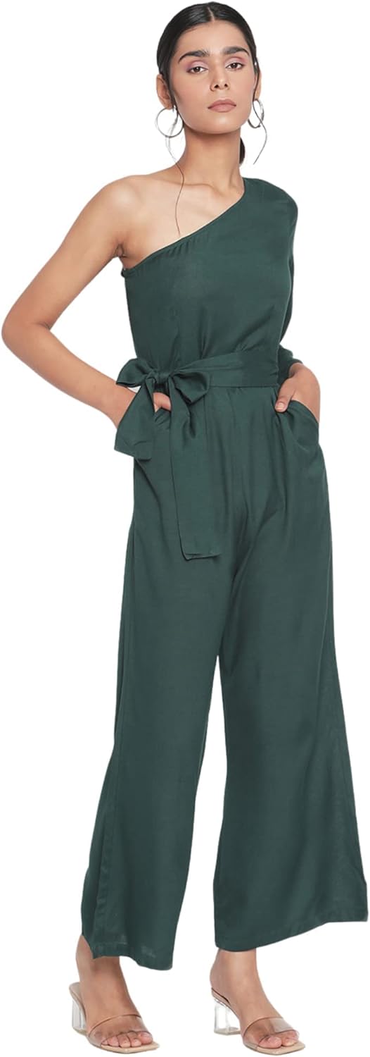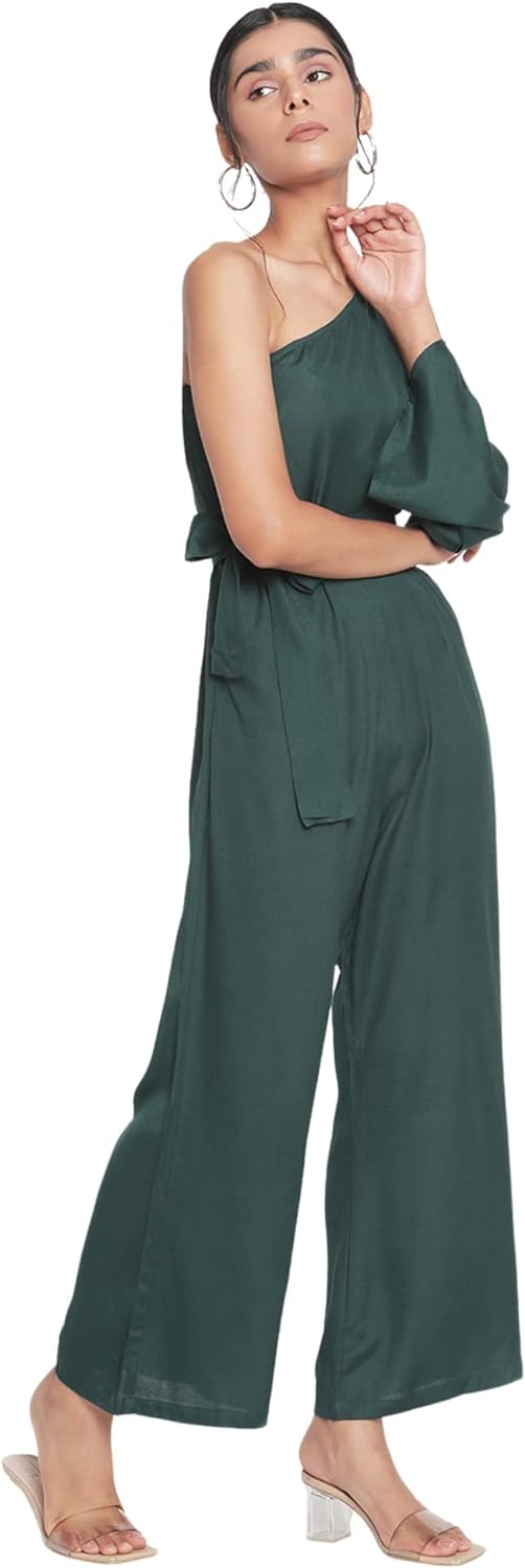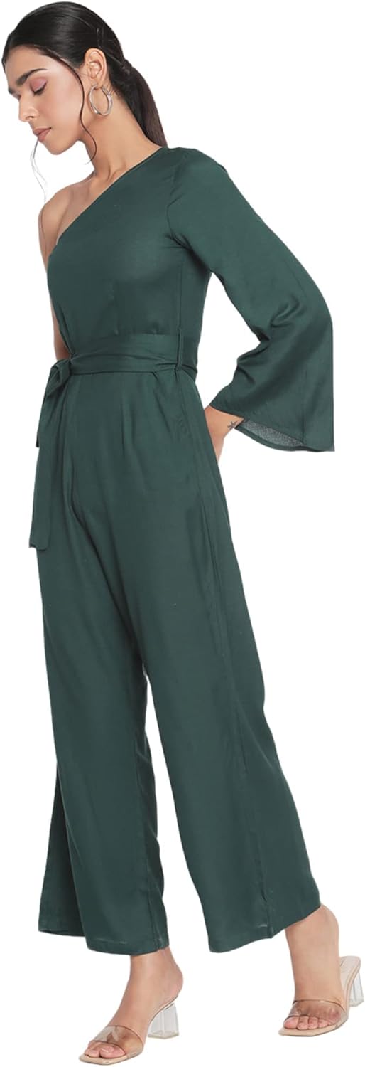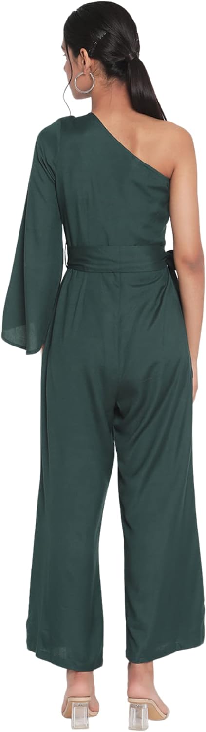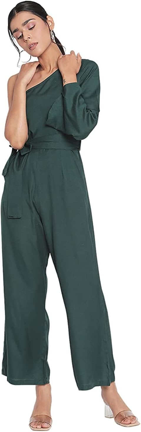 Styleville.in One Shoulder Jumpsuit with One Long Sleeves and One Off Sleeves is tailored in Rayon with soft wash with one shoulder. Women/girls can wear for both formal or casual look. Comfortable and regular fit, sits along you body without clinging too much. Ideal for all seasons and occasions. Comes in green color and large size.