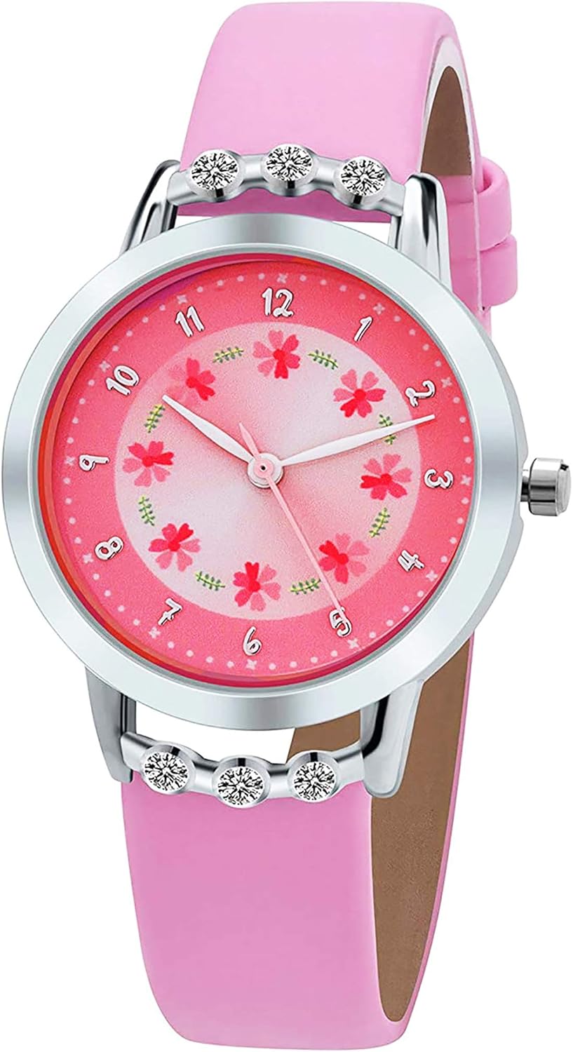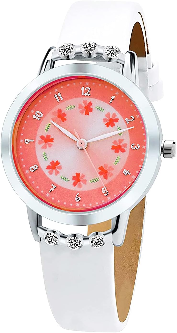 Girls Watches,Flowers Diamond Wrist Watch Leather Band Quartz Cute Waterproof Watches for Kids Girls