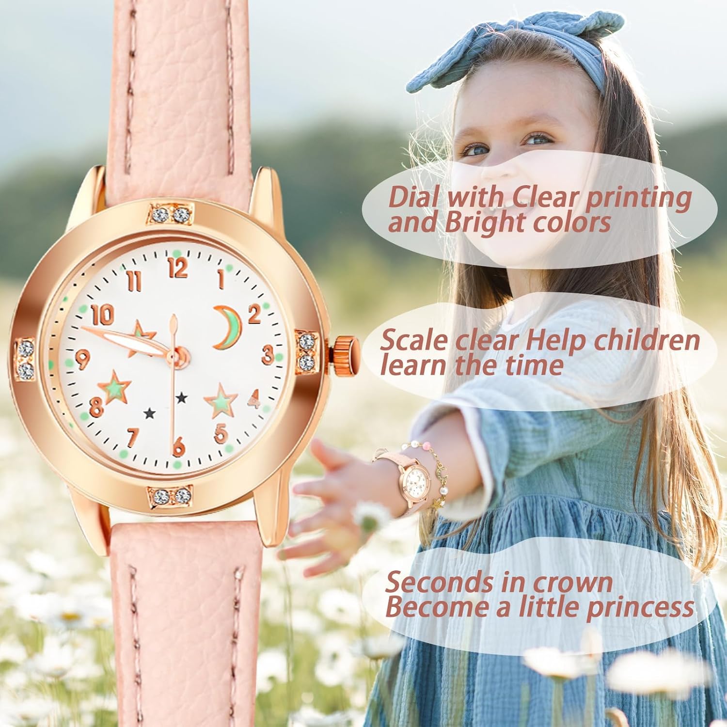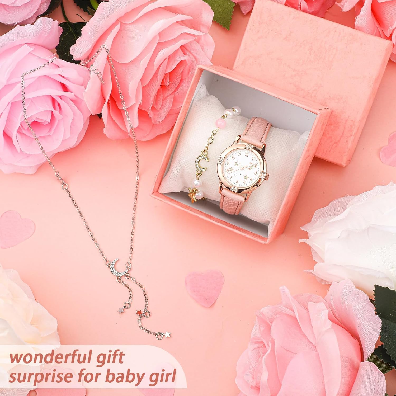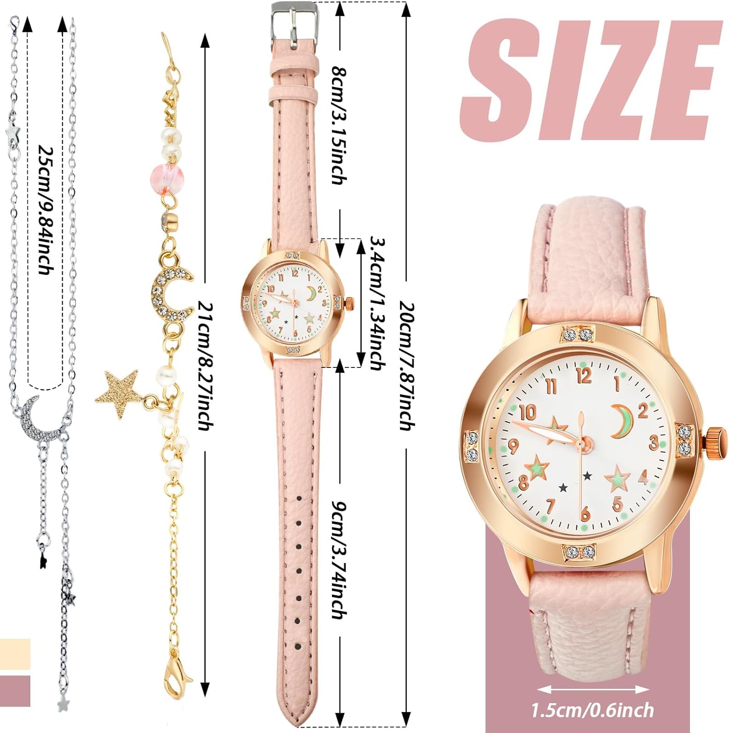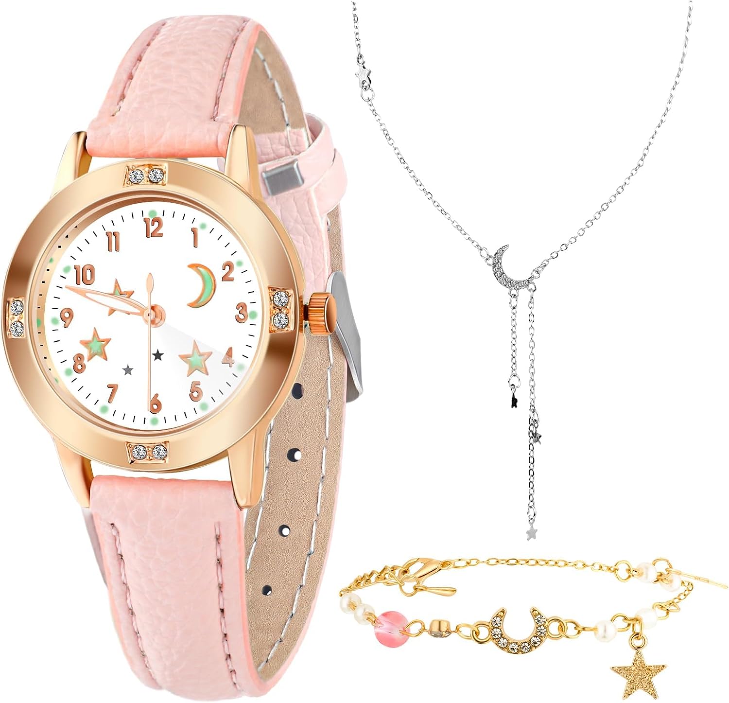 - Packaged Set: our product package includes 1 pink colored girl's watch, 1 moon star necklace, 1 bracelet, and 1 box; This entire set is carefully curated to meet the taste of young girls and works as a gift option for birthdays and celebrations