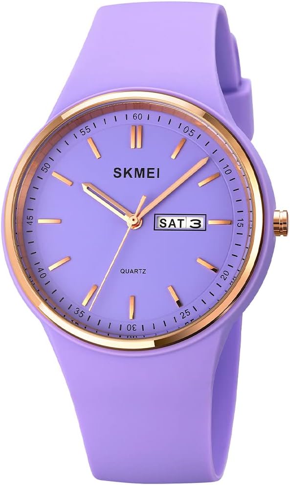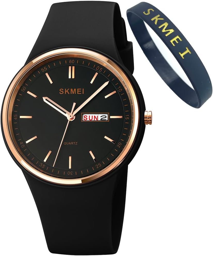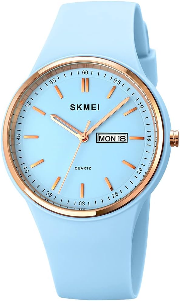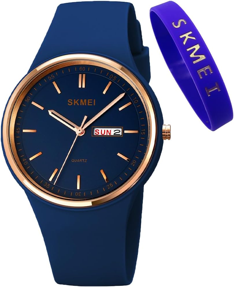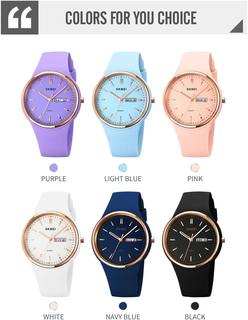 - SKMEI Women's Watch Silicone Band Quartz Analog Simple Dial Design: Watches for young women fashion round gold case, soft and durable silicone band with buckle closure, easy to put on or take off.
