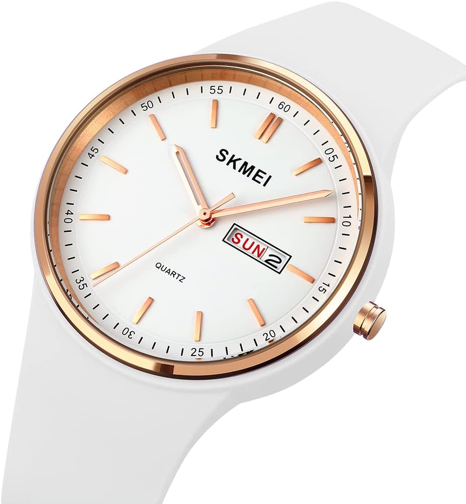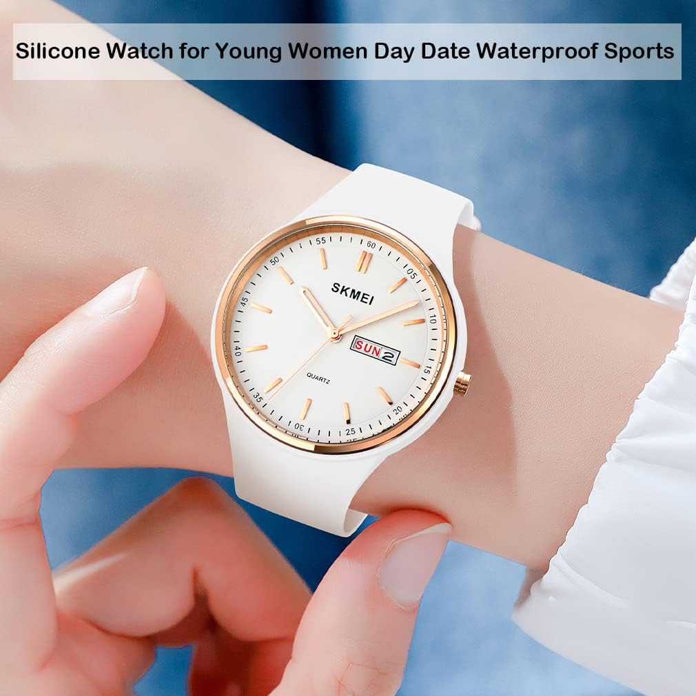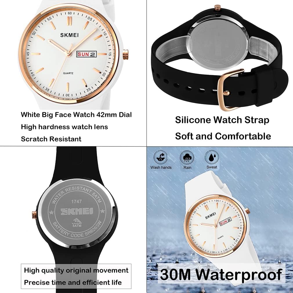 SKMEI Watches for Young Women Lady Sports Silicone Band Big Face Large Waterproof Fashion Casual Simple Quartz Analog Day Date Girls Gift White Wrist Watch