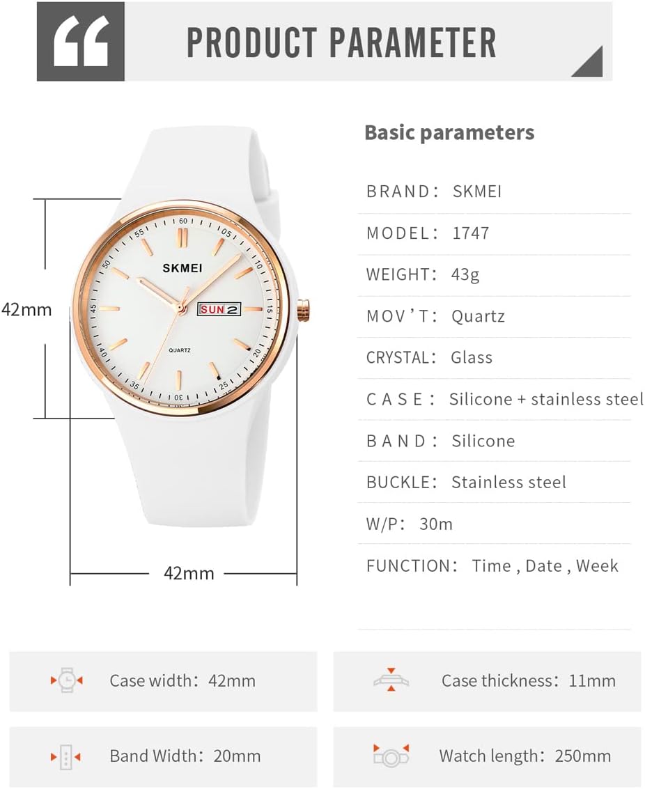 SKMEI Women's Watch Silicone Band Quartz Analog Simple Dial Design: Watches for young women fashion round gold case, soft and durable silicone band with buckle closure, easy to put on or take off.Big Face Large Watches for young women fashion sports: Have a stable quality Japanese quartz movement. Black Pink White Blue silicone strap girls watches use a high quality anti-reflective durable coated dial window to prevent scratches and damage. t is not only a watch, but also a part of your fashion style.Sports Watches for Young Women Waterproof simple big face large dail : Watches Cheap Popular Know the time to arrange your daily work. Efficient and quick work. 3ATM up to 30 meters Waterproof, hand washing, swimming, daily use is waterproof, not suitable for underwater activities. Note: Do not press the button underwater. Not suitable for swimming or bathing.Silicone watches for women simple fashion and cute: Blue Black Pink White Purpule strap, sofe and comfortable, color fastness, breathability, perfect for your arm. You can choose the color you like to match your outfit according to your mood and preferences at the moment. Women's Watch Beautiful Gift Watch for yourself, your lover or your friends. Wonderful design silicone wrist watch for young ladies, girls and womens.Recommended for Christmas, Mother's Day, birthdays, wedding gifts, Valentine's Day etc. The best gift, the perfect gift. L1747 Women Watches: thickness 11MM,Diameter 42MM, Silicone Band Width 20mm, Length 250mm, Weight 43G.