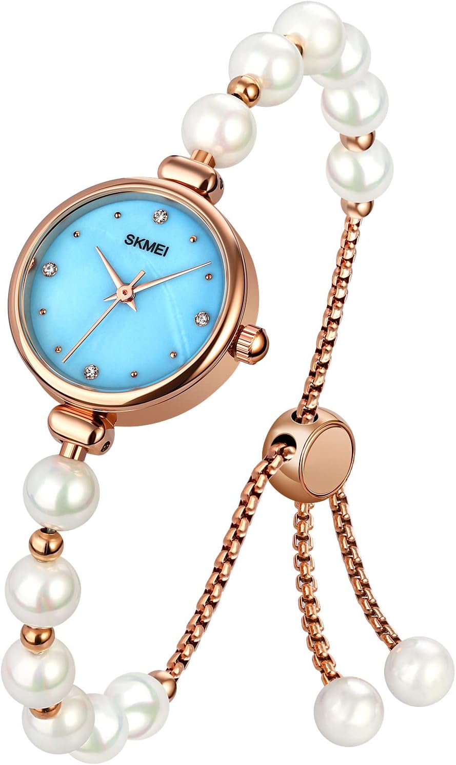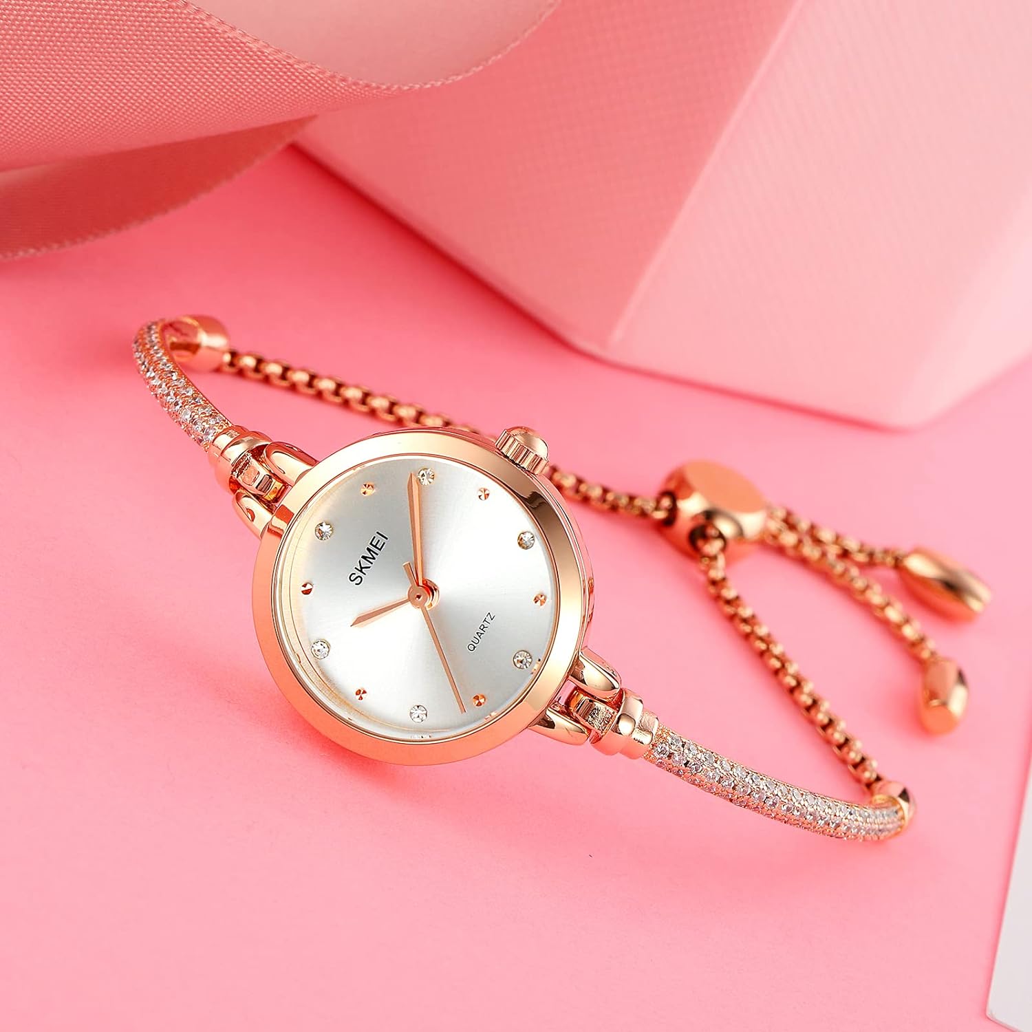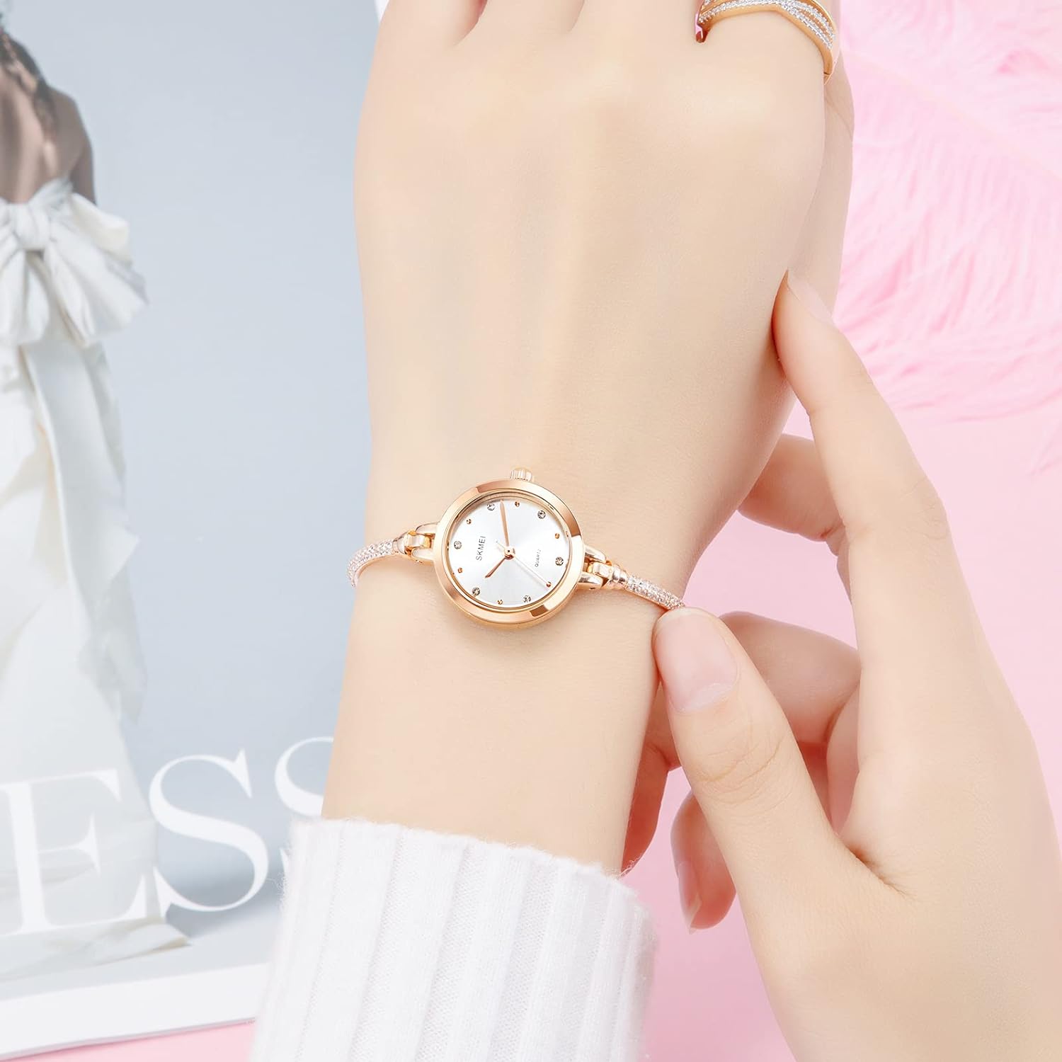 SKMEI Women Watches Bracelet Diamond Ladies Female Small Rose Gold Fashion Luxury Thin Waterproof Analog Quartz Casual Girls Wife Gifts Silver Wrist Watch