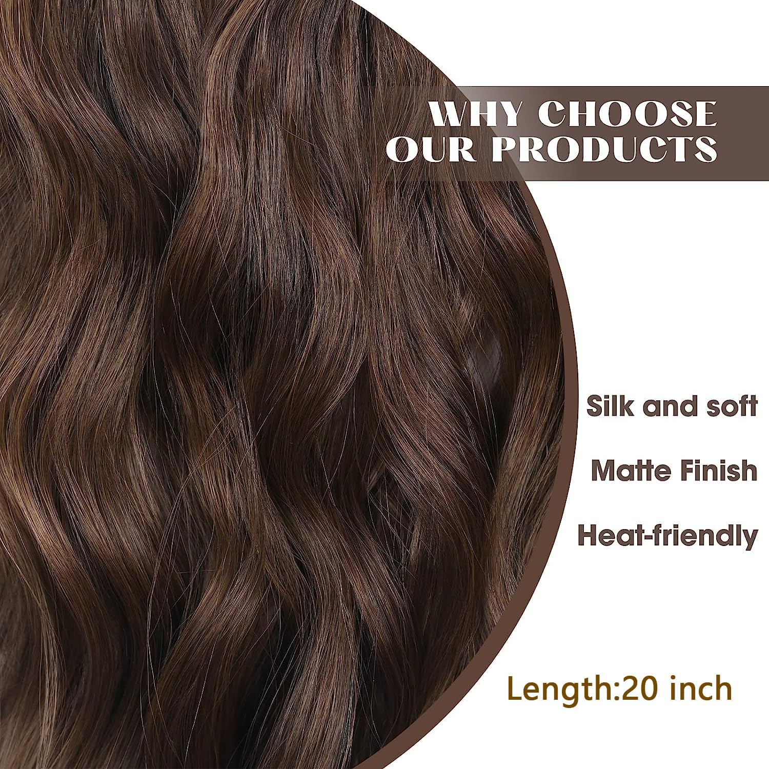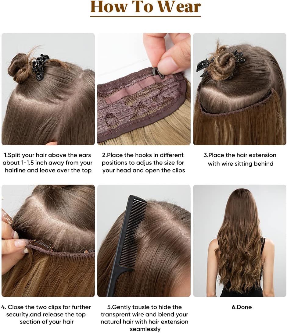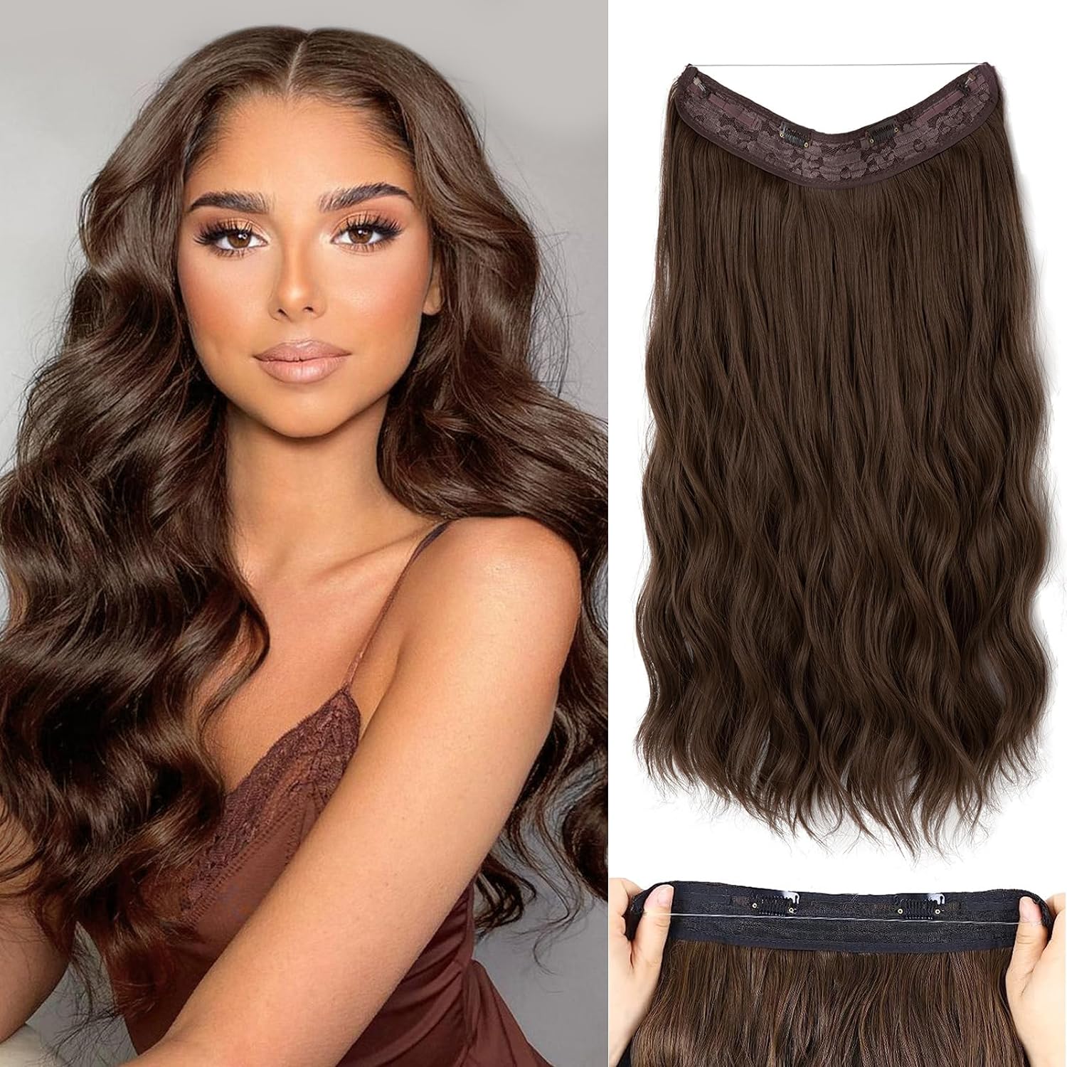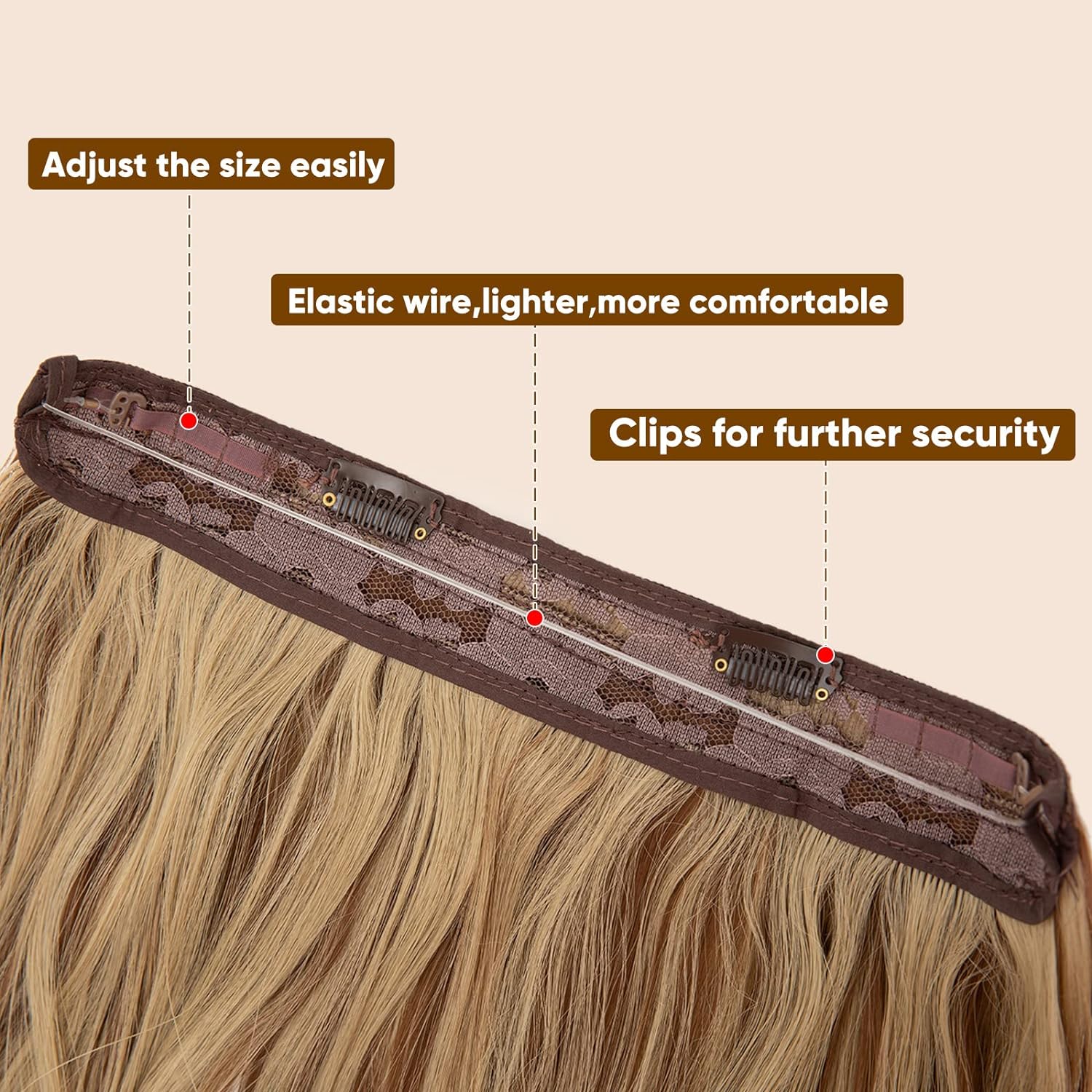Goodern Invisible Wire Curly Wavy Hair Extension,20 Inch Natural Big Wavy Secret Wigs Clips Long Synthetic Hairpieces Adjustable Headband One Piece Wire Hair Piece Extensions for Women Girl-Gold Brown