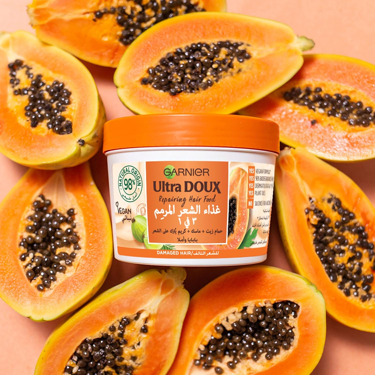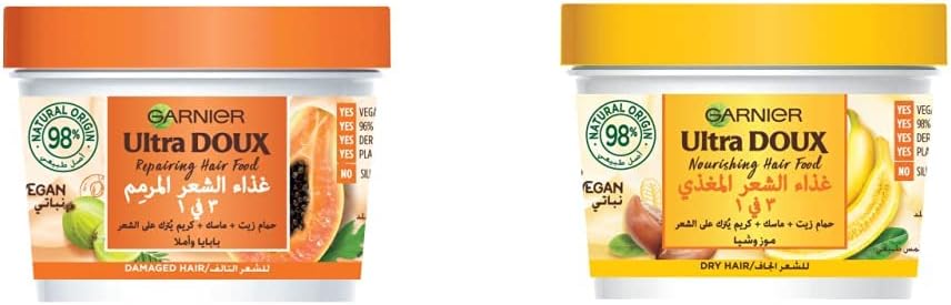 Contents. 1x Garnier Ultimate Blends Hair Food, Papaya Three in One Damaged Hair Mask Treatment, Volume 390ml