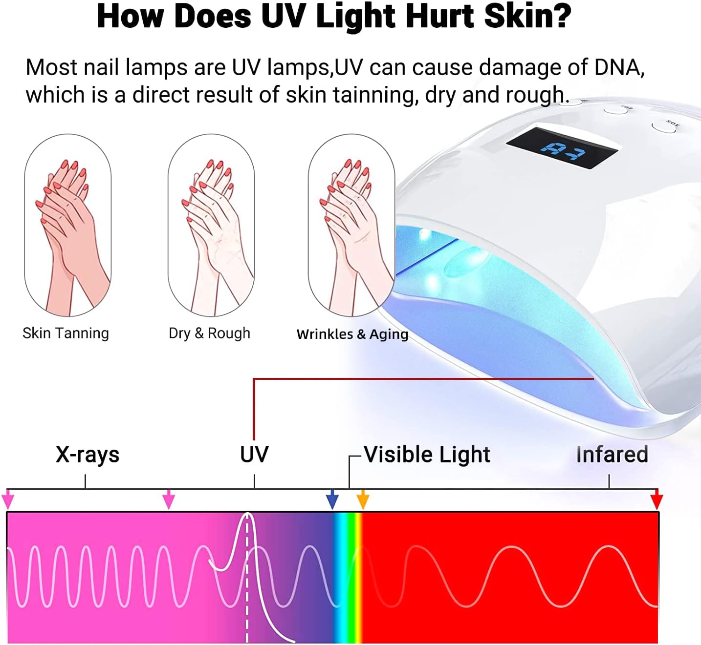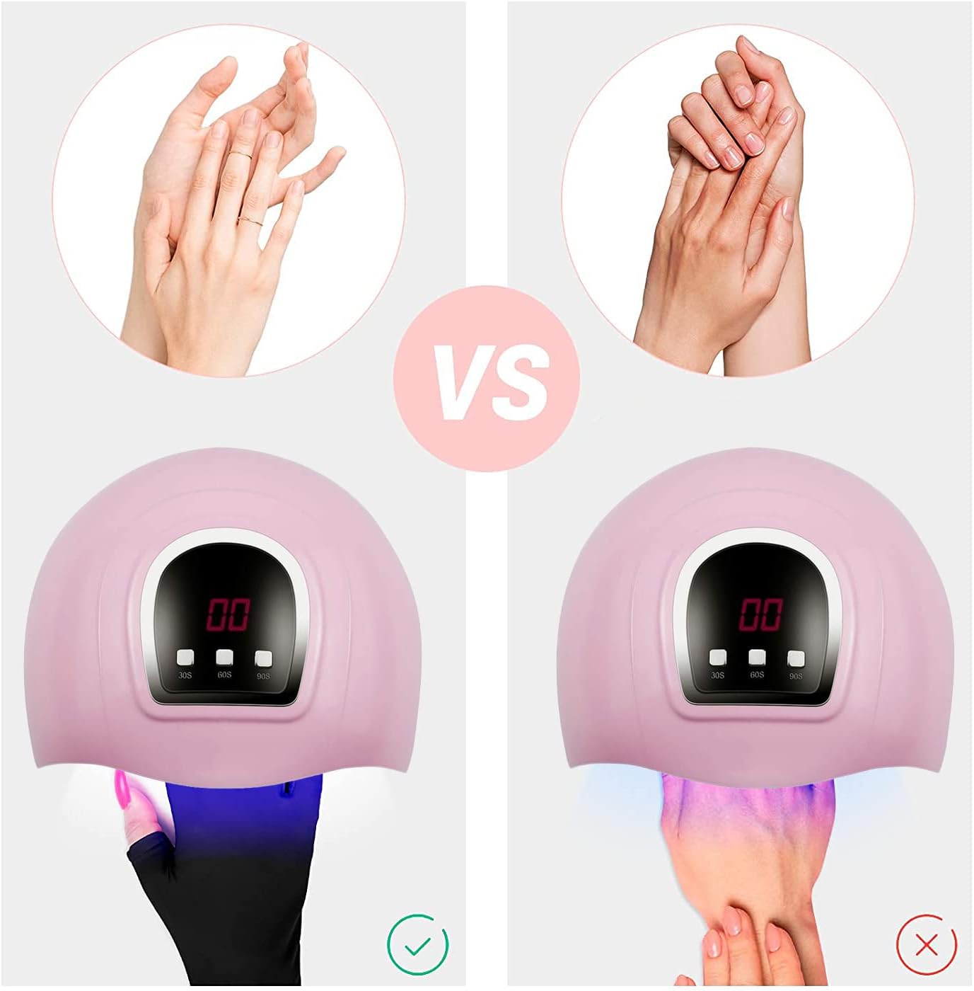 - 【Why Should We Wear Gloves】Most nail curing lamps are UV lamps, UV causes damage of the DNA, which is a direct result of skin tanning. The high energetic lamp light also emit a harmful light, called High-Energy Visible Light, this type of light can lead to skin problems sometimes. Frequent use of nail lamps without protective measures will make your hand skin dark, dry, rough and aging.