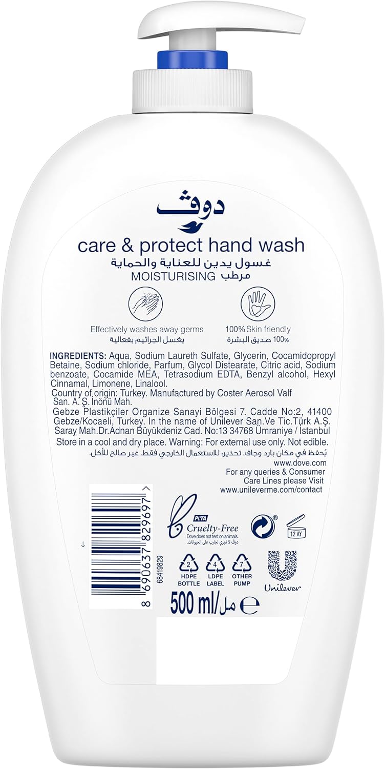 DOVE Care & Protect Moisturising Hand Wash, 100% sensitive skin friendly, Original, with ¼ moisturising cream, 500ml x 3