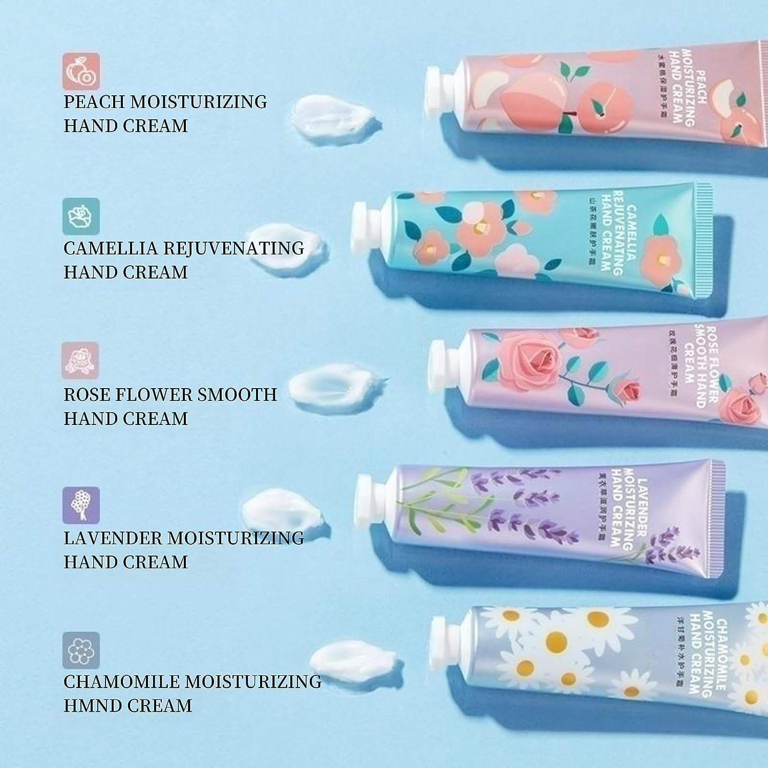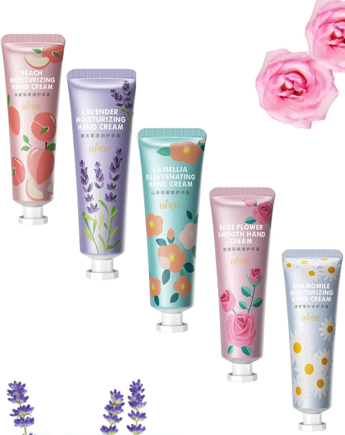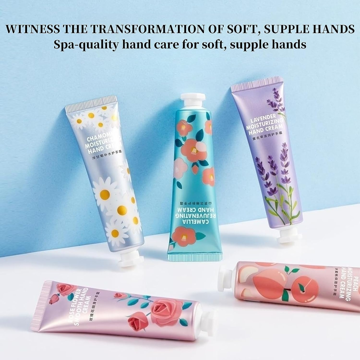 【Contains Five Fragrant Hand Cream Multipack】Peach moisturizing, Camellia rejuvenating, Rose flower smooth, Lavender moisturizing, Chamomile moisturizing. There are 5 different scents to choose from, they all have gorgeous fragrance, choose your favorite fragrance according to your mood, enhance your spirit and cultivate your soul.