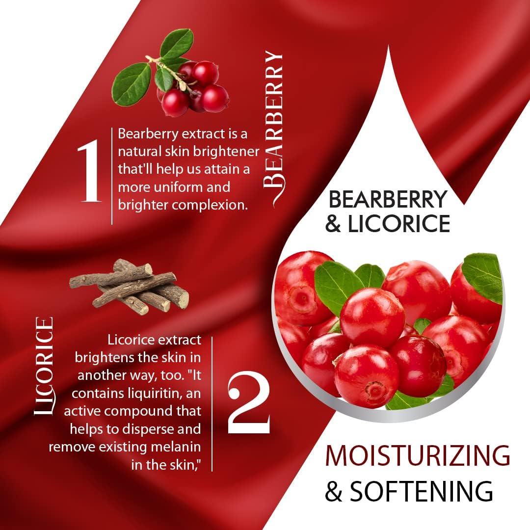 Brightening Powerhouse: Our advanced formula combines the potent properties of bearberry and licorice extracts to effectively target dark spots, discoloration, and uneven skin tone. Bearberry extract, a natural skin brightener, helps to fade the appearance of hyperpigmentation, while licorice extract helps soothe and calm the skin, revealing a more radiant complexion
