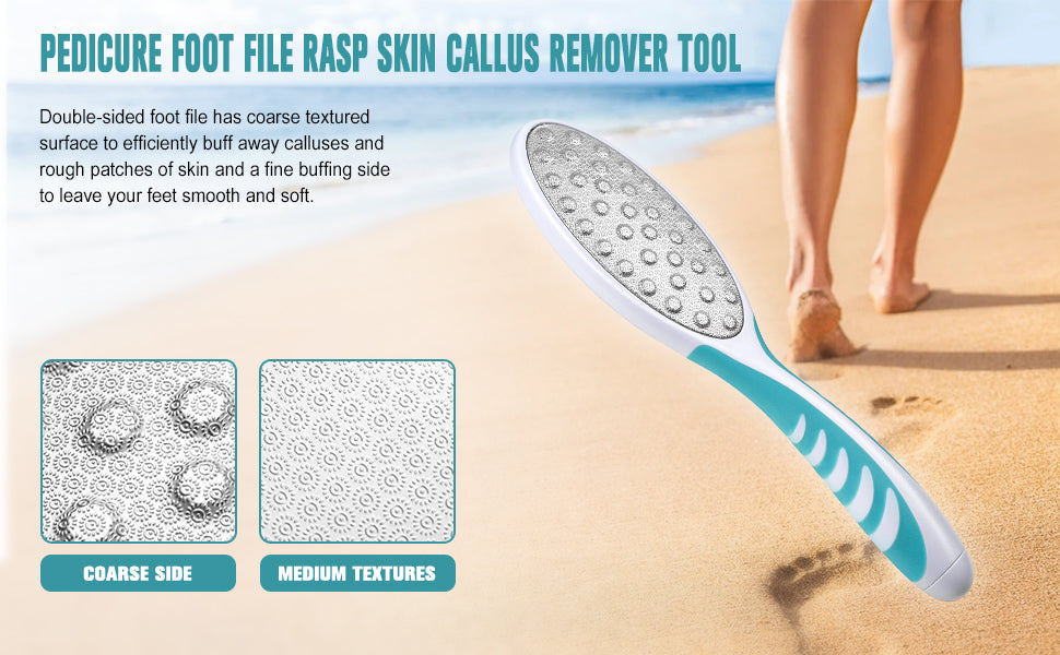 ✅ACHIEVE A SMOOTH FOOT: Use our product to prepare for callus-free and smooth feet. Ours is a double-sided pedicure foot files tool the rough side will help you eliminate calluses, cracked heels, and dead skin, and the fine side sand your feet to make them tender and silky smooth by exfoliating hard dead skin.
