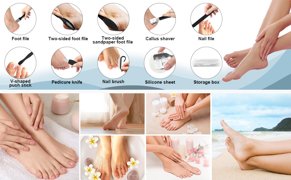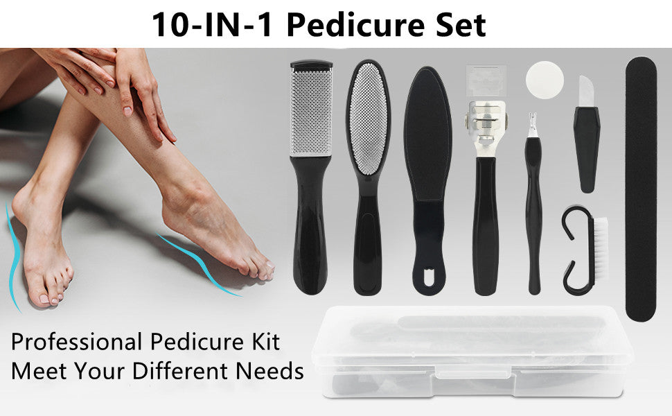 【10-IN-1 Pedicure Kit Multifunctional Pedicure Tools Set】 The foot care products is effectively remove corn, dead skin, stubborn callus and thick nails safely and painlessly, peel the dead or rough skin. Leaving you with baby-soft and smooth feet and make you enjoy the fun of foot caring. Suitable for both professional and at-home pedicure.