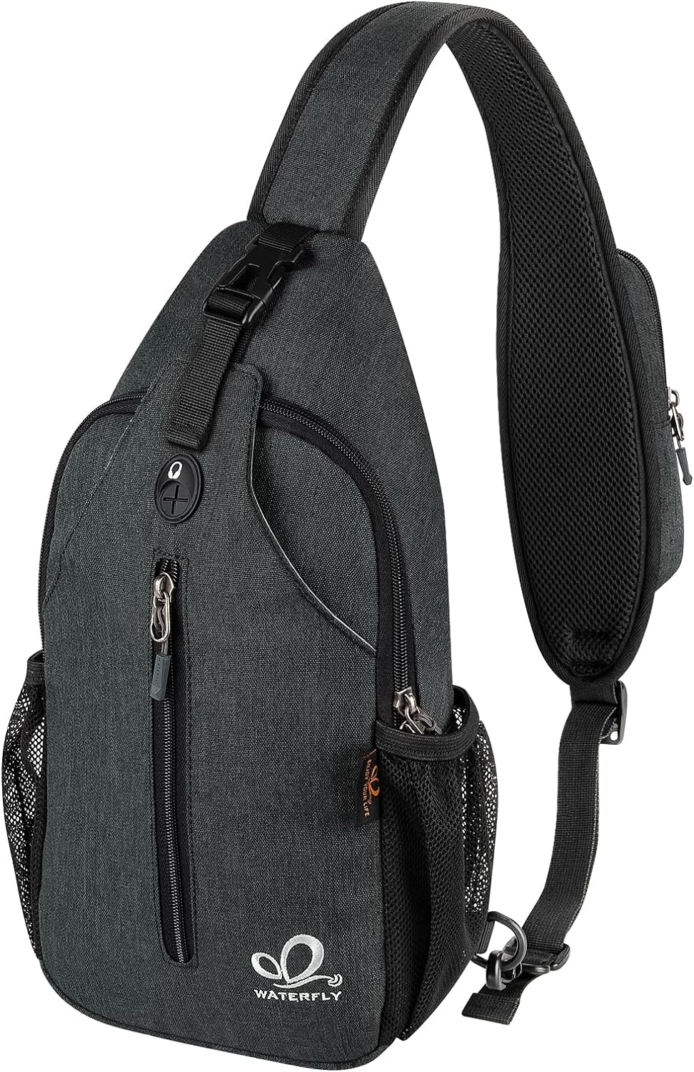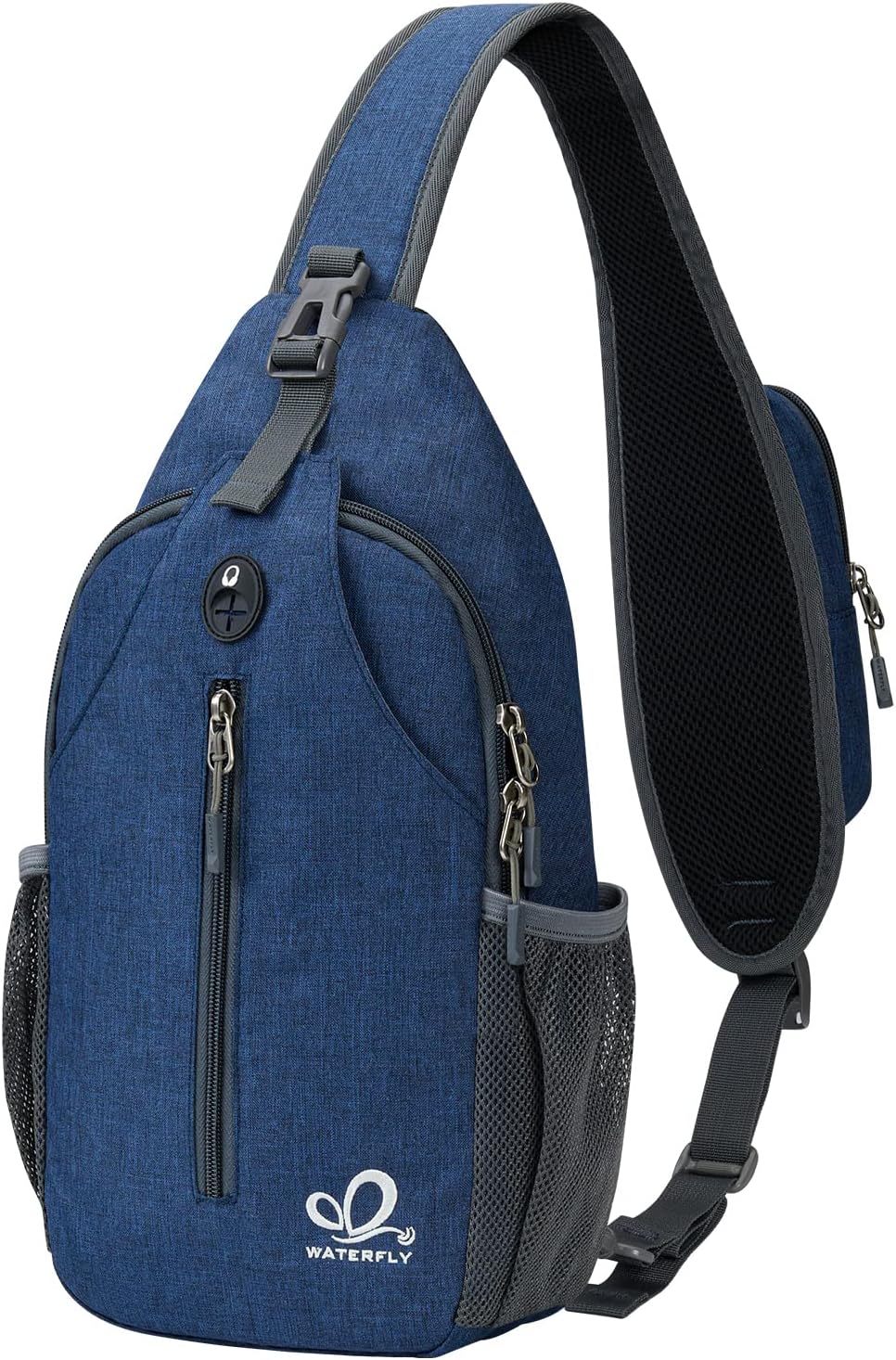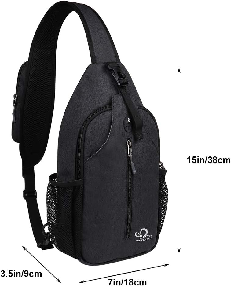 WATERFLY ENJOY YOUR LIFE We focus on outdoor products. We are devoted to quality. Description WATERFLY Mini Sling Bag ?Made of superior cotton linen material, water repellent, easy to clean and anti-friction, effectively prevent it from tearing, wetting and ripping. ?The special sided hidden earphone hole allows you to enjoy music easily. ?Multiple compartments keep all your stuffs in order. ?Equipped with special burglarproof zipper and buckle, easy and convenient to operate. ?There is a back hidden zippered pocket, you can store some valuables like wallet, bank card, passport, etc. ?Perfectly works as a shoulder pack, chest bag, crossbody backpack and travelling bag, always keeps your hands free. ?Modern fashion style and exquisite details make it durable and fit for all ages. Specifications Size: 16.1 x 7.1 x 2.4" / 41 x 18 x 6cm (H x L x W) Weight: 1.01lb. / 458g Optional Colors: Black, blue, gray Warranty If you have any issues with our products, please feel free to contact us. Package Included 1 x WATERFLY Sling Chest Bag
