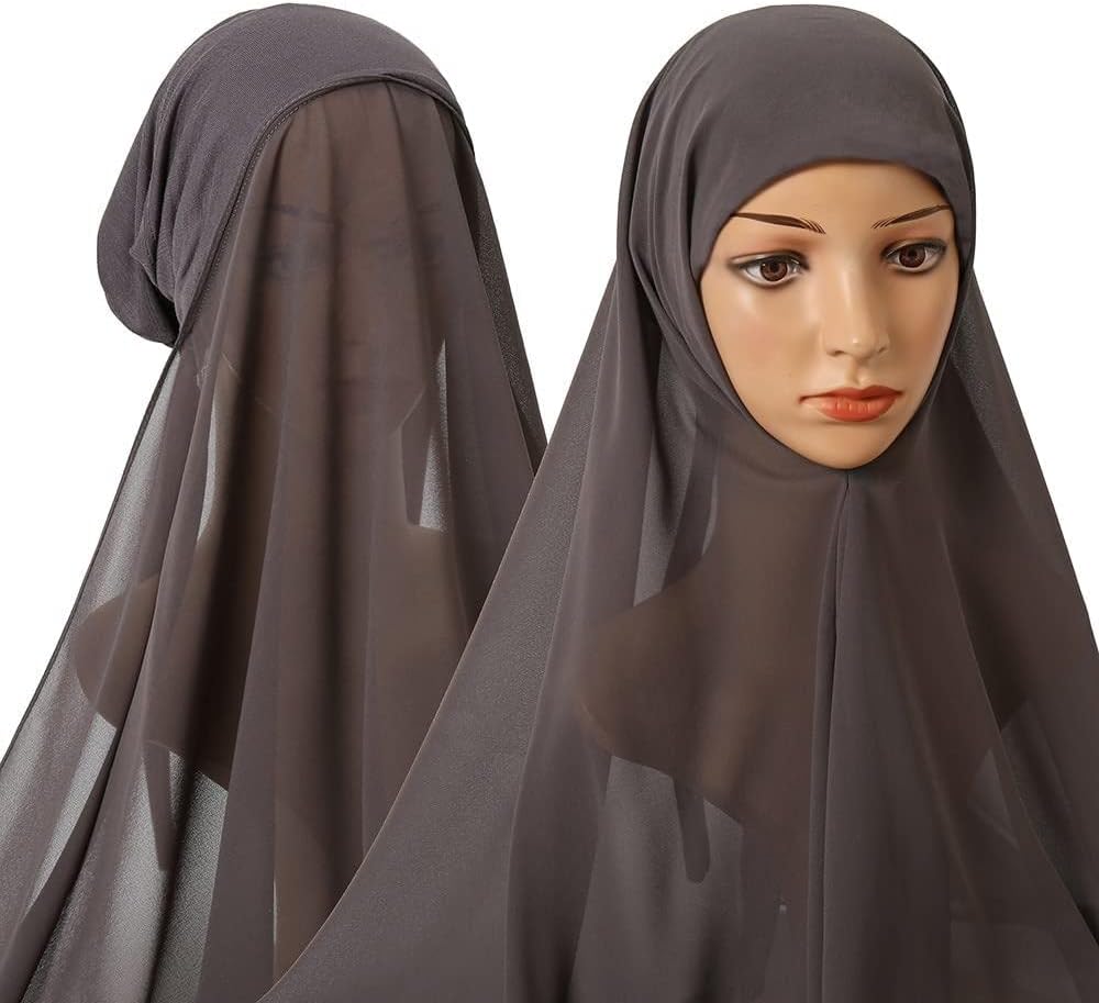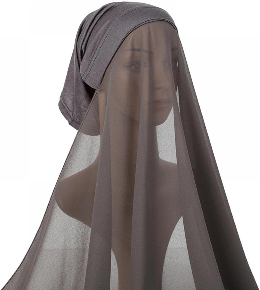 Goodern Instant Chiffon Hijab with Veil Muslim Fashion Solid Color Chiffon Head Wraps Under Scarf Caps with Undercap Muslim Turban Wrap Soft Long Under Scarf Tube Cap for Women Daily Wear-Grey