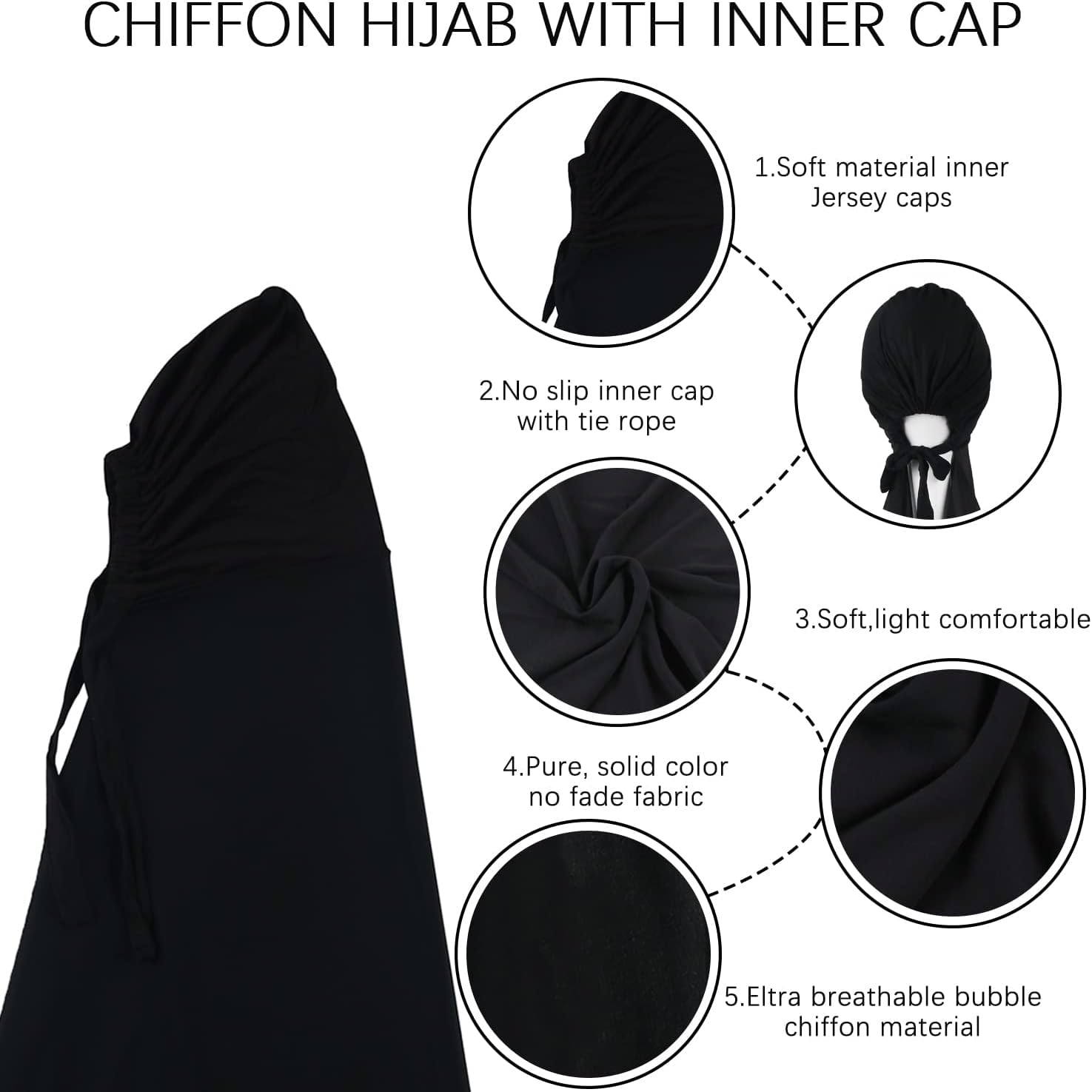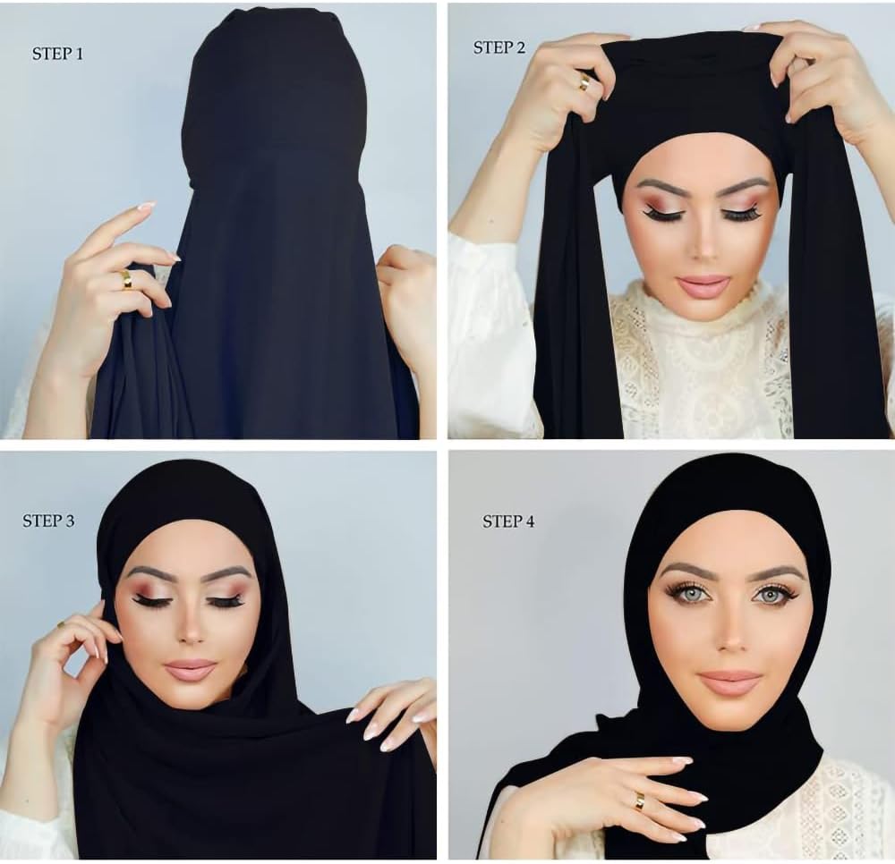 - 🖤 - INSTANT HIJAB SIZE - chiffon: 180 X 70 cm, cap : 9.8 X 7.8 cm; Suitable for women with head circumference of 56-58cm (22"~22.8"). A very delicate and durable to wear and keep stylish! You will wear this shawl just like bonnet and you are good to go. With different color options, you can look stylish without dealing with all that wrapping, tying, and without compromising from your beliefs.