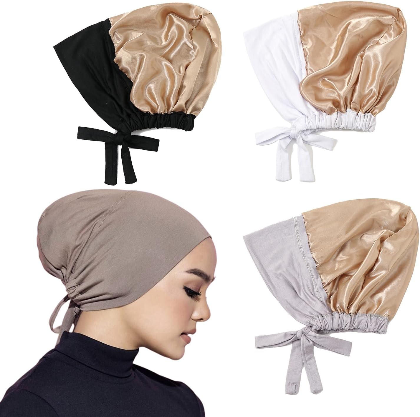 [Upgrade] 3 Pieces Muslim Satin Lining Jersey Inner Hijab Cap for Women Underscarf with Tie Bonnet Turban Hat Headband,Premium Non-Slip Hijab Underscarf, Adjustable Tightness to Your Liking