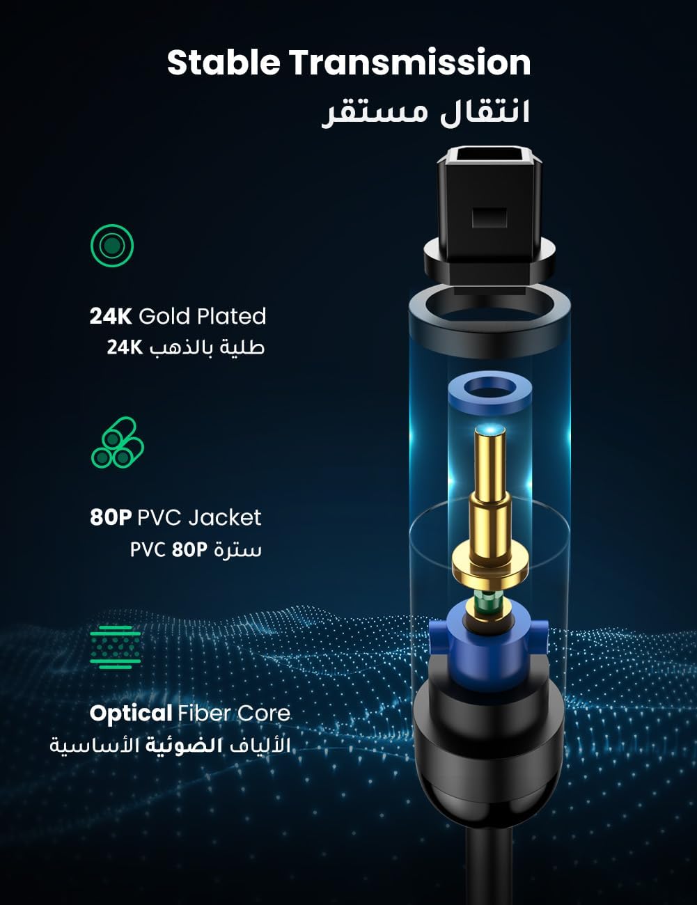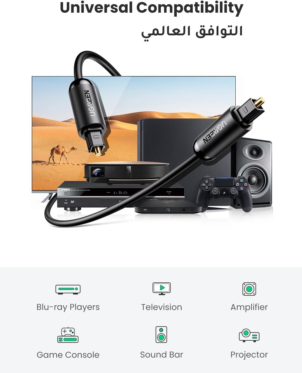 【Universal Compatibility】UGREEN fiber optic audio cable is adaptable and can connect to various soundbars and home theatres for increased sound clarity with TVs, compatible for PS4, Blu-Ray players, and more. Stable and reliable with a heat-resistant optical fiber core, this premium TV optical cable can transmit signals without any electromagnetic or radio frequency interference.