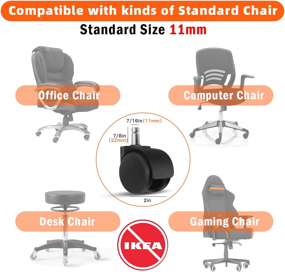 [Size]:Fits most floors, enjoy smooth gliding.Our office chair wheels are made of universal industry standard size 11*22mm, compatible with 99% of office chairs on the market. Stem diameter is 7/16" and length is 7/8".
