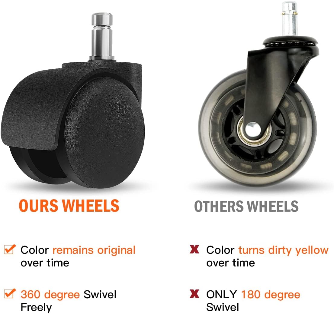 [Farewell to noise]:Say goodbye to squeaky and wobbly chair wheels as our rotating wheels ensure a noise-free and smooth glide. The soft rubber covering on the wheels allows silent operation without damaging your floors, providing the most stable and silent rolling experience for uninterrupted work sessions.
