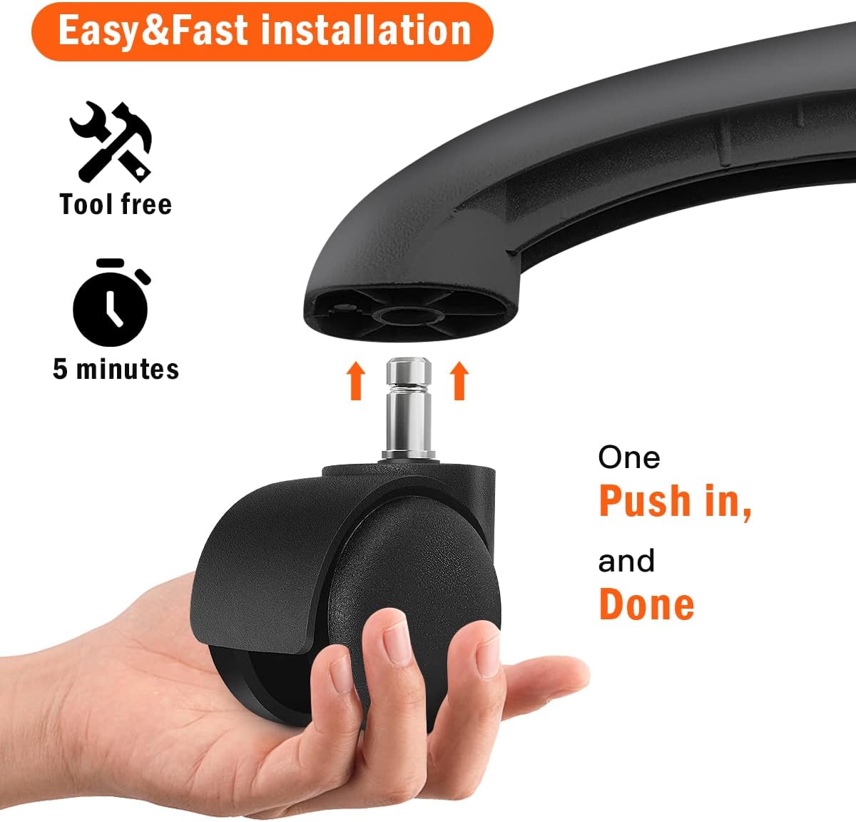 [Easy to install]: the replacement process is quick and tool-free. Simply insert your new casters into place and they fit securely on most office chairs and stools. Upgrade your furniture with our home office furniture casters and experience easy mobility like never before.