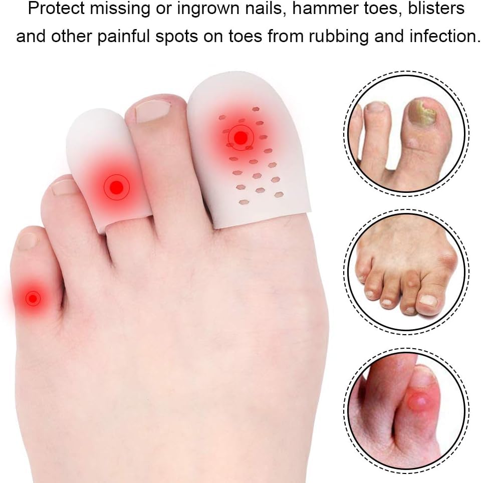 • Relieve Pain & Prevent Injury: Designed to reduce friction and relieve pain, these professional silicone toe covers can help reduce corns, blisters, calluses, and relieve discomfort from ingrown toenails, overlapping, missing nails, and hammer toes. Protect your toes from injuries without the complicated bandages.