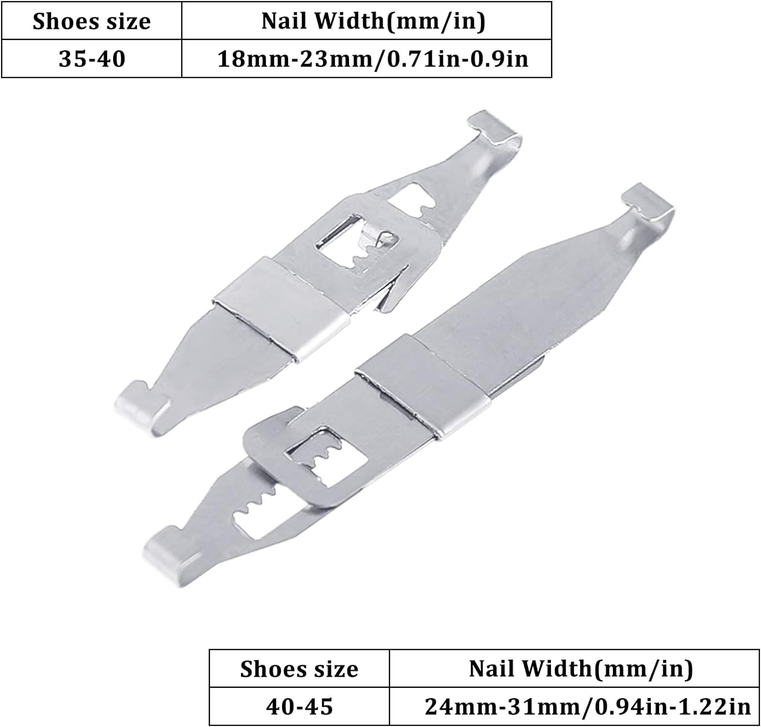 Specification:Material: Stainless SteelSize: Approx.35-39|18.0mm-23.0mm40-42|24.0mm-28.0mm43-45|24.0mm-31.0mmHow to Use:The products are buckled separately at the ends of the toenails.Push the two buttons together.Circle the other buttons with the iron ring below.Package included:4 x Ingrown Toenail Corrector4 x Storage BoxWarm Tips:1. When the paronychia is severely irritated, it is not recommended to wear it for a long time to avoid worsening the infection.2. You can wear it for about half an hour when you soak your feet at night (you can wear it before and after soaking your feet).3. It is recommended to remove it for strenuous exercise such as running, climbing, long walking, etc. to avoid congestion caused by excessive toenails.4. Before wearing, properly bend the buckle to reduce the strength according to the thickness of the toenails and the degree of curling, to avoid discomfort caused by wearing them for a long time.