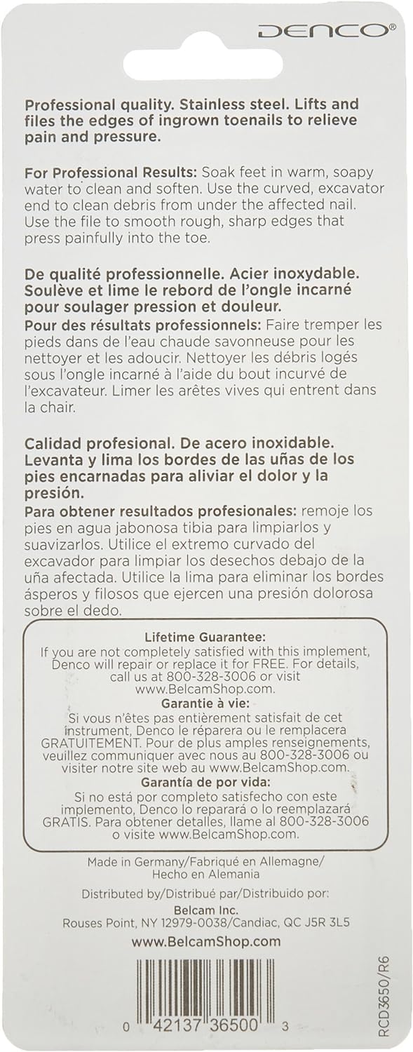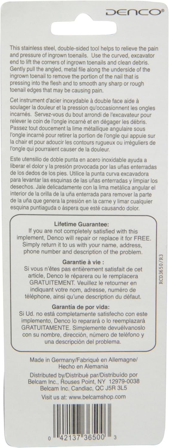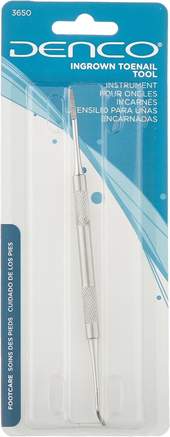 This stainless steel, double-sided tool helps to relieve the pain and pressure of ingrown toenails. Use the curved, excavator end to lift the corners of ingrown toenails and clean debris. Gently pull the angled, metal file along the underside of the ingrown toenail to remove the portion of the nail that is pressing into the flesh and to smooth any sharp or rough toenail edges that may be causing pain.