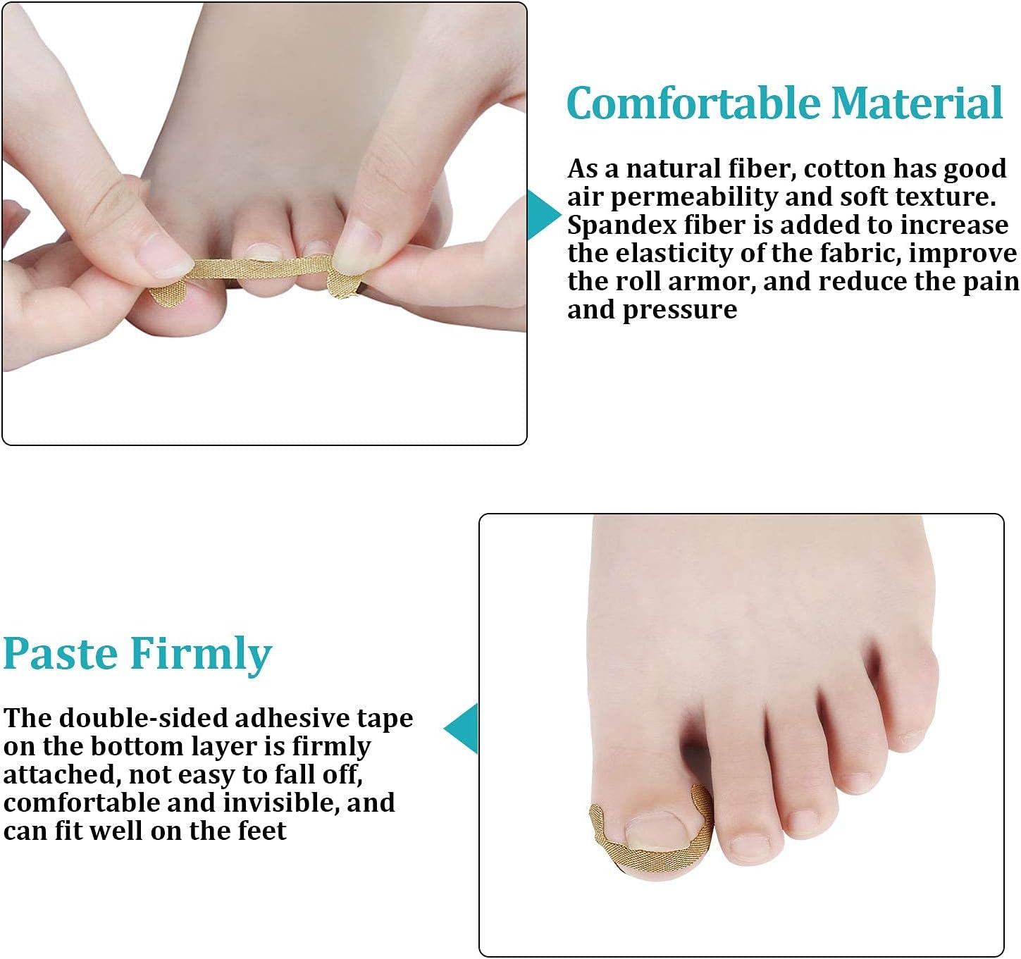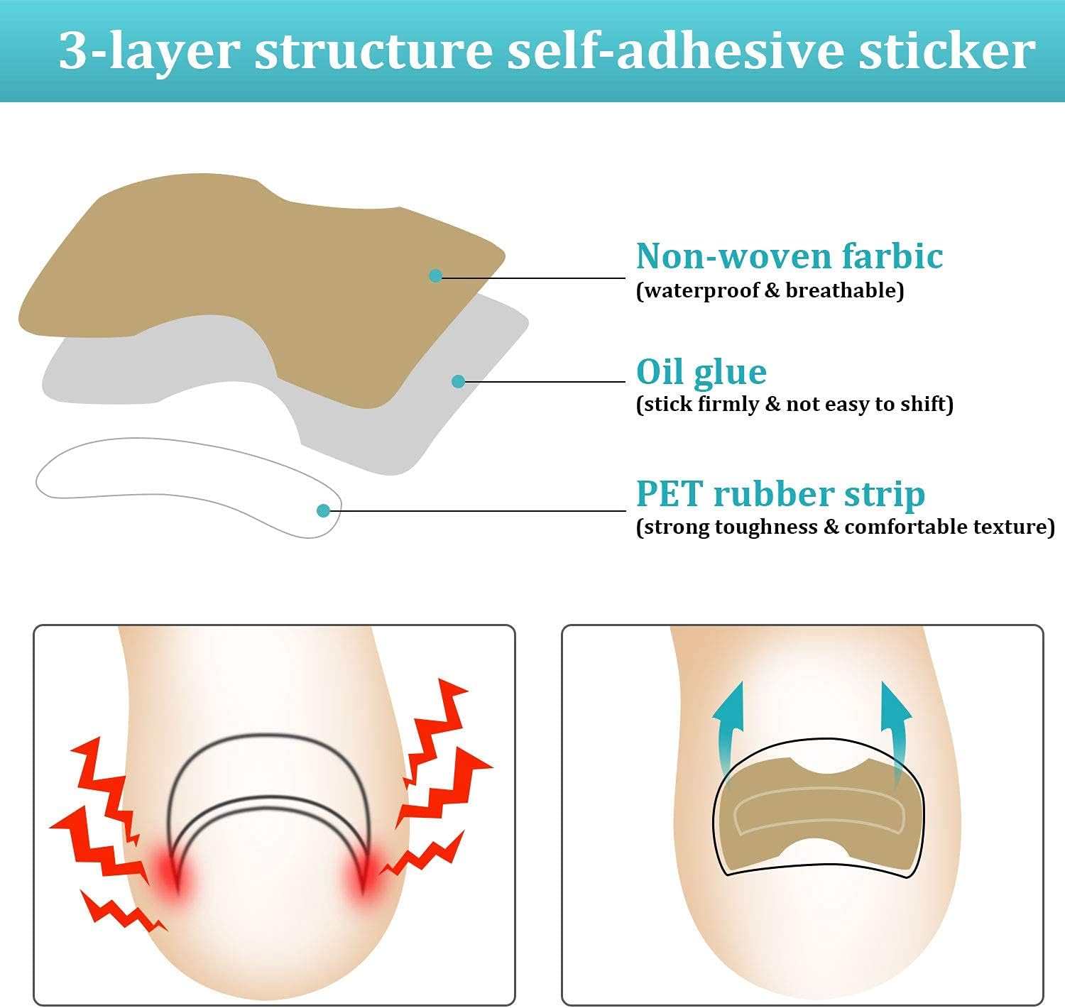 【Toenail correction stickers】: Come with 2 different kinds of toenail correction stickers, which are made of cotton material, which is featured with good breathability and elasticity, can be effectively attached to the surface of the nail and will produce upward pulling force, allowing you to slowly pull out the embedded part in the nail.