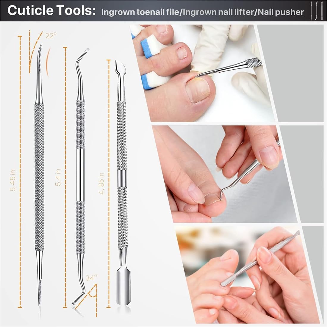- 🔥【Comprehensive Nail Care Set】 Our ingrown toenail removal kit includes a range of essential tools such as a heavy-duty toenail clipper, nail clipper, an ingrown toenail file, a nail lifter, a nail file, a nail cuticle pusher, a nail cuticle fork, and an acne needle. Each tool is designed to provide comprehensive nail care and is applicable to all disinfection techniques, reducing the risk of toenail fungus transmission.