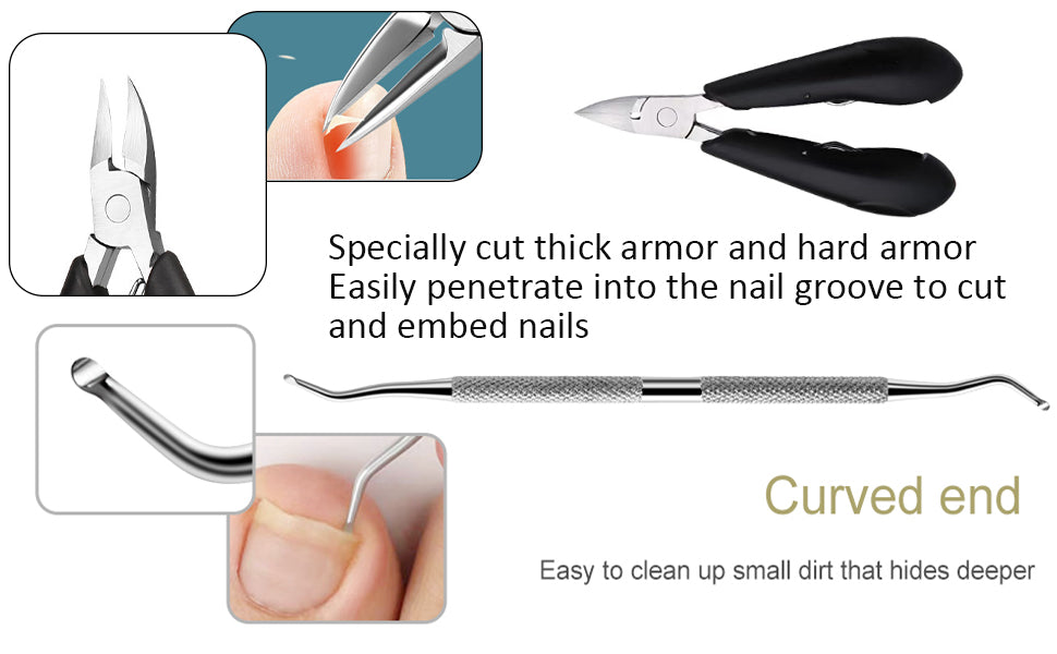 【 WHAT YOU GET 】 5pcs tools + 1 PU packaging case. The 25 degree arc and ingrown toenail tool can deep into groove to cut ingrown and thick toenail simply. The pedicure kit handle is non-slip and softer, the handle keep lighter and easier to operate.