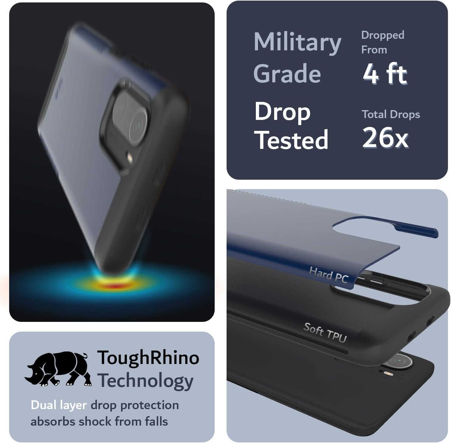 Certified military grade protection and ToughRhino Technology for dual layer protection against drops and scratches