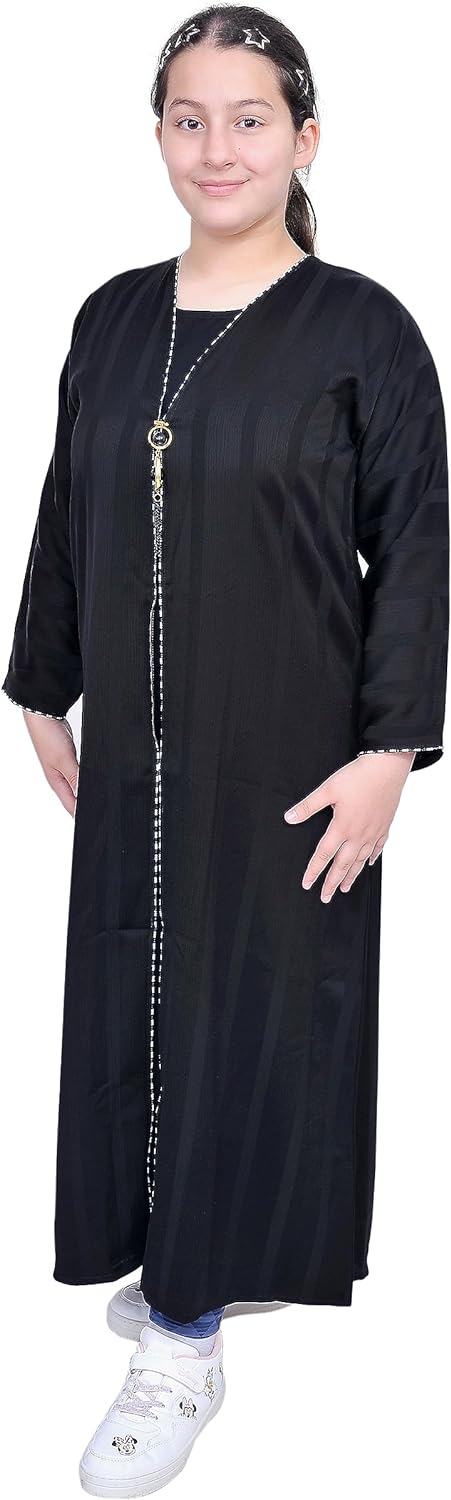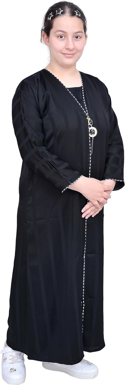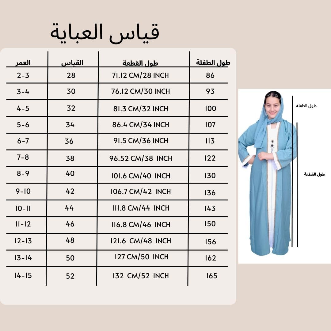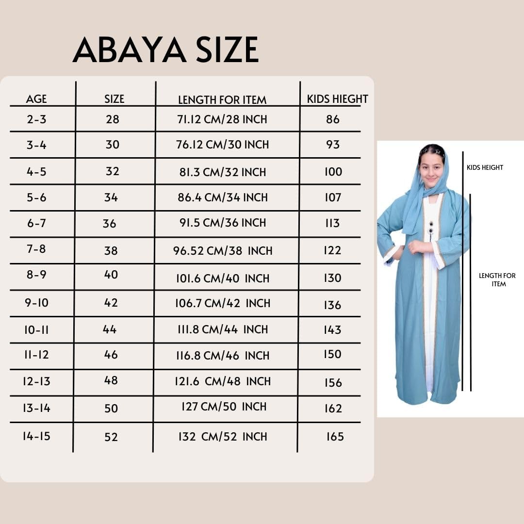 Girl Abaya made of high quality fabric, comes in different colors and size to choose from. Size for girl from 2 to 14 years old, Please read the size chart carefully this will give you guide before purchase, weight and height are better than age in choosing the correct size.