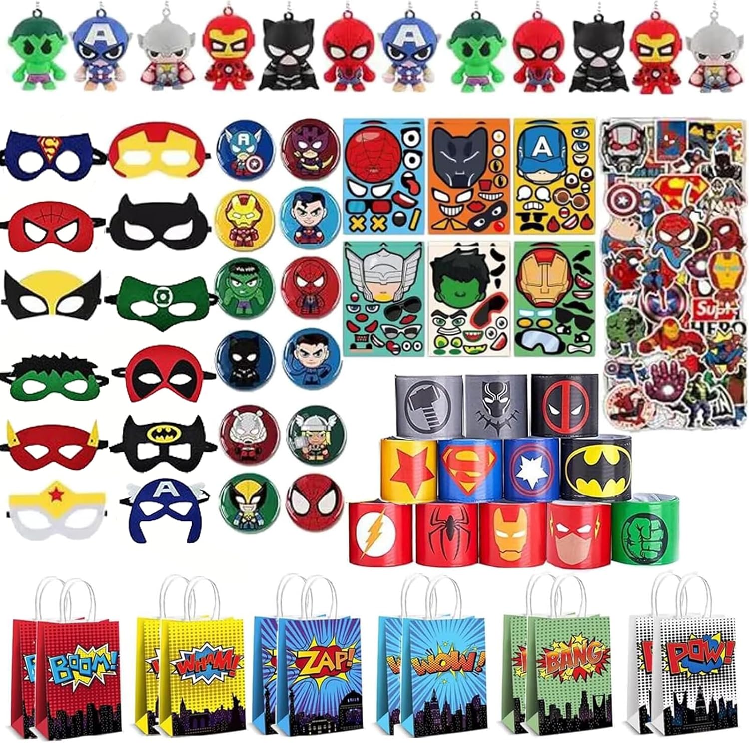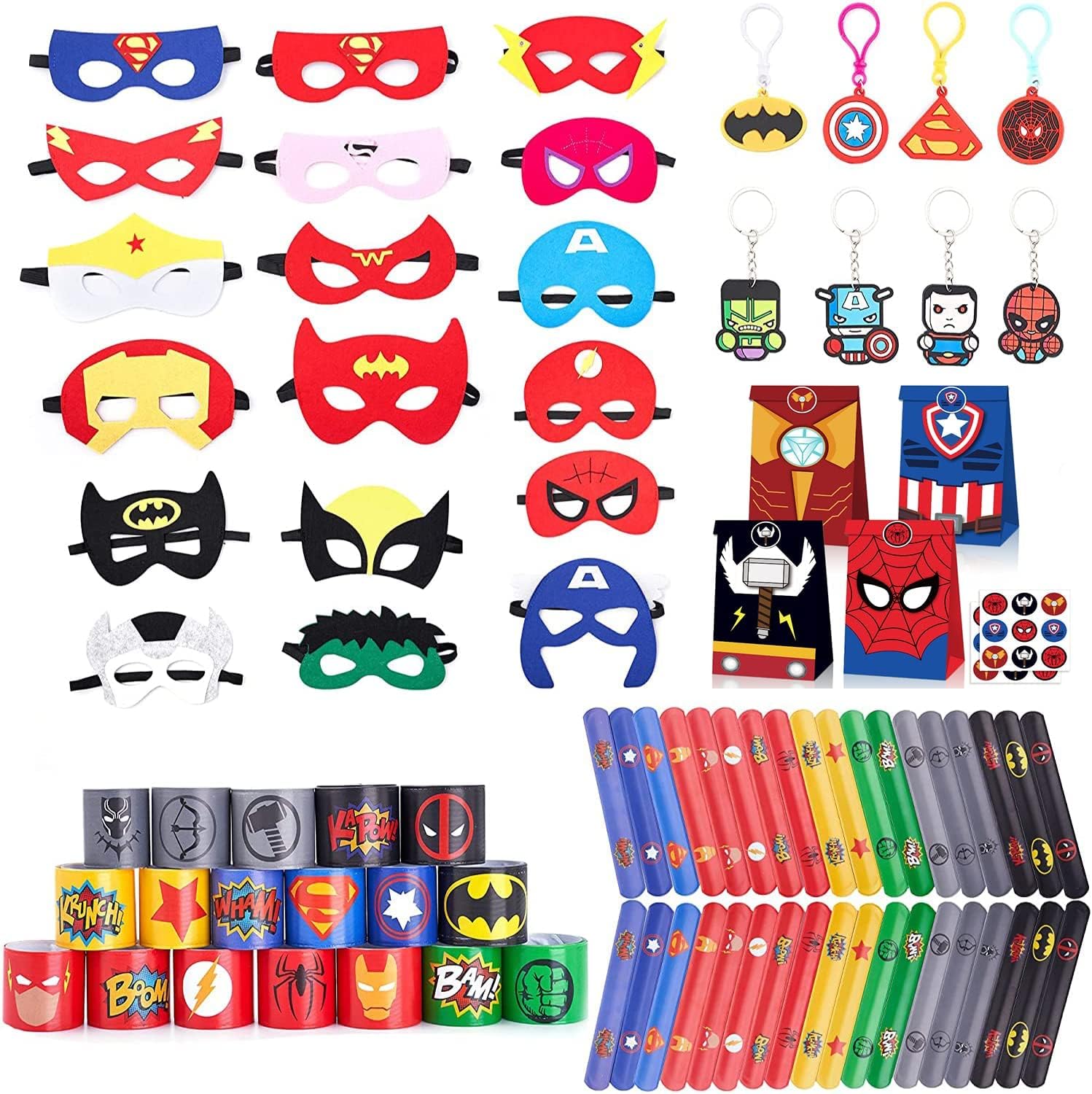 Beauenty Party Articles Superhero Birthday Party Gift Set Includes 18 Pcs Party Articles Superhero masks, 18Pcs Keychains 18Pcs Gifts Bag,36pcs Superhero Hand Slap Bracelet(108PC)