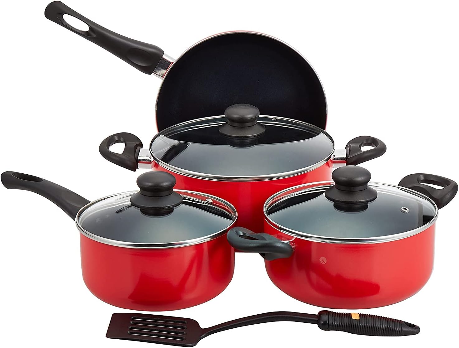 HIGH-GRADE ALUMINUM, SUITABLE FOR MULTIPLE HOBS – The pans and saucepans are all made from high-grade aluminum. This metal is sturdy and does not have any toxic effects on the food.