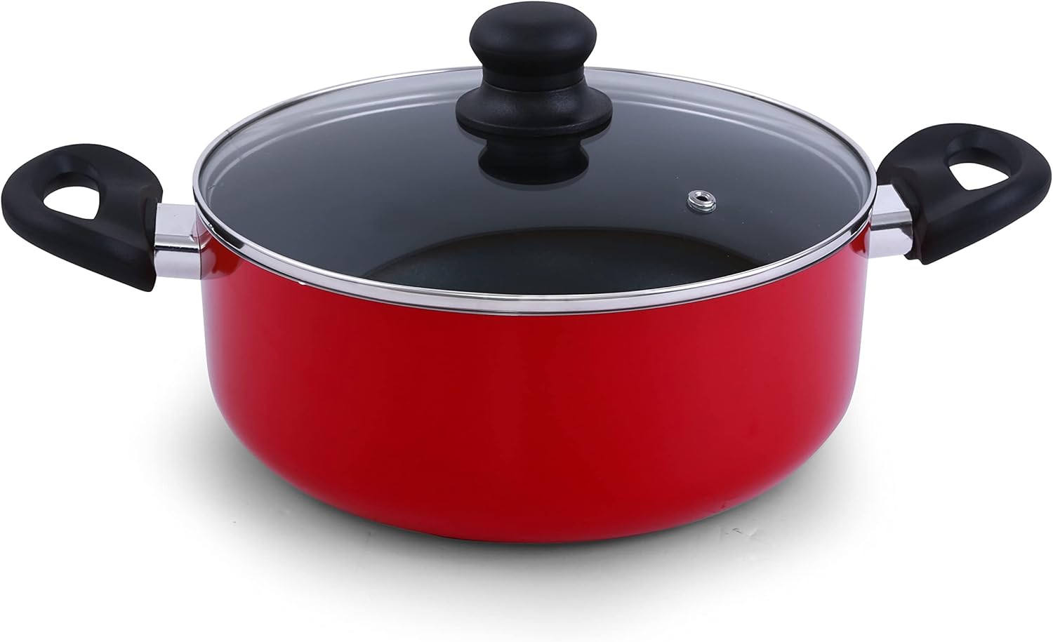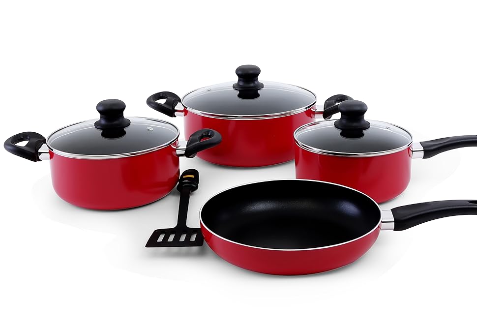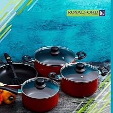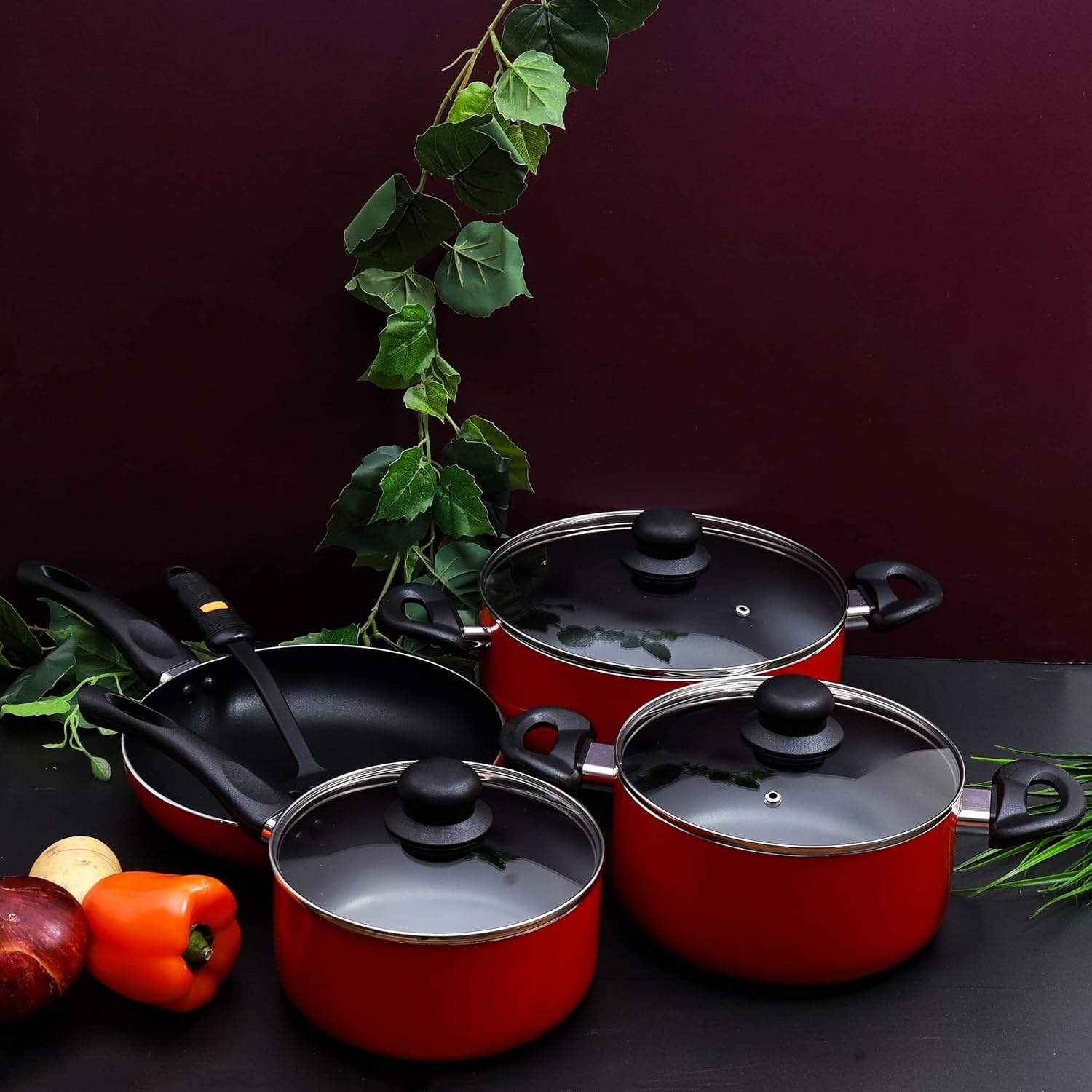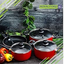 Royalford Cookware Set, 8 Pieces, Red, RF6082 Scratch Resistant, Tempered Glass Lids, 2.5MM Body Thickness, Bakelite Knobs, and CD Bottom