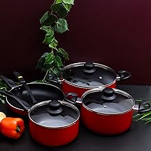 THICK BODY, TEMPERED GLASS LID – The body thickness makes the tools lightweight and easy to maneuver. The saucepans and casserole come with temperature glass lids. This glass is resistant to breakage, scratch-proof, and does not get foggy due to smoke.